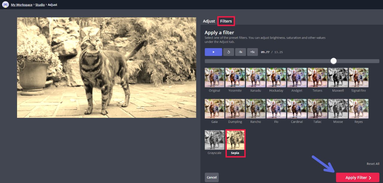 Filters and Colors: Adjust the colors in your video using drag and drop sliders. Increase the brightness, saturation, blur, and contrast, apply a sepia or black and white filter, or choose from other pre-set options. We’re planning to add more color effects in the future too!