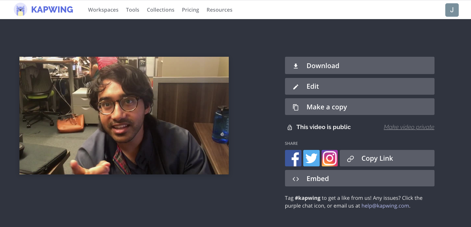 After your shortened video is processed, you can download it to share the MP4 with friends or publish on social media. The video file is hosted on Kapwing, so you can also share the URL of the trimmed video page instead of downloading the file.
