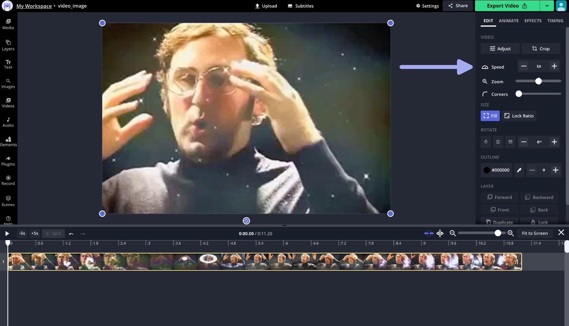 After the video uploads, it shows up in the Kapwing editor. You can click the video and use the "Speed" control on the right-hand side to make your video go faster and shorten the overall duration.