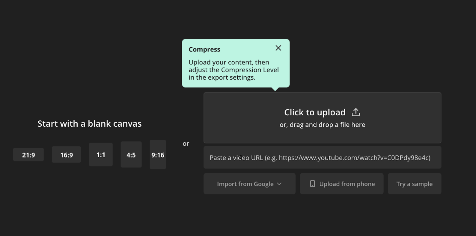 Head over to our Video Compressor tool or jump into the Kapwing editor directly to get started. Then, select the "Click to upload" button to upload a file from your device, or paste in a live video URL to import that video into the Kapwing editor. Easy, right?