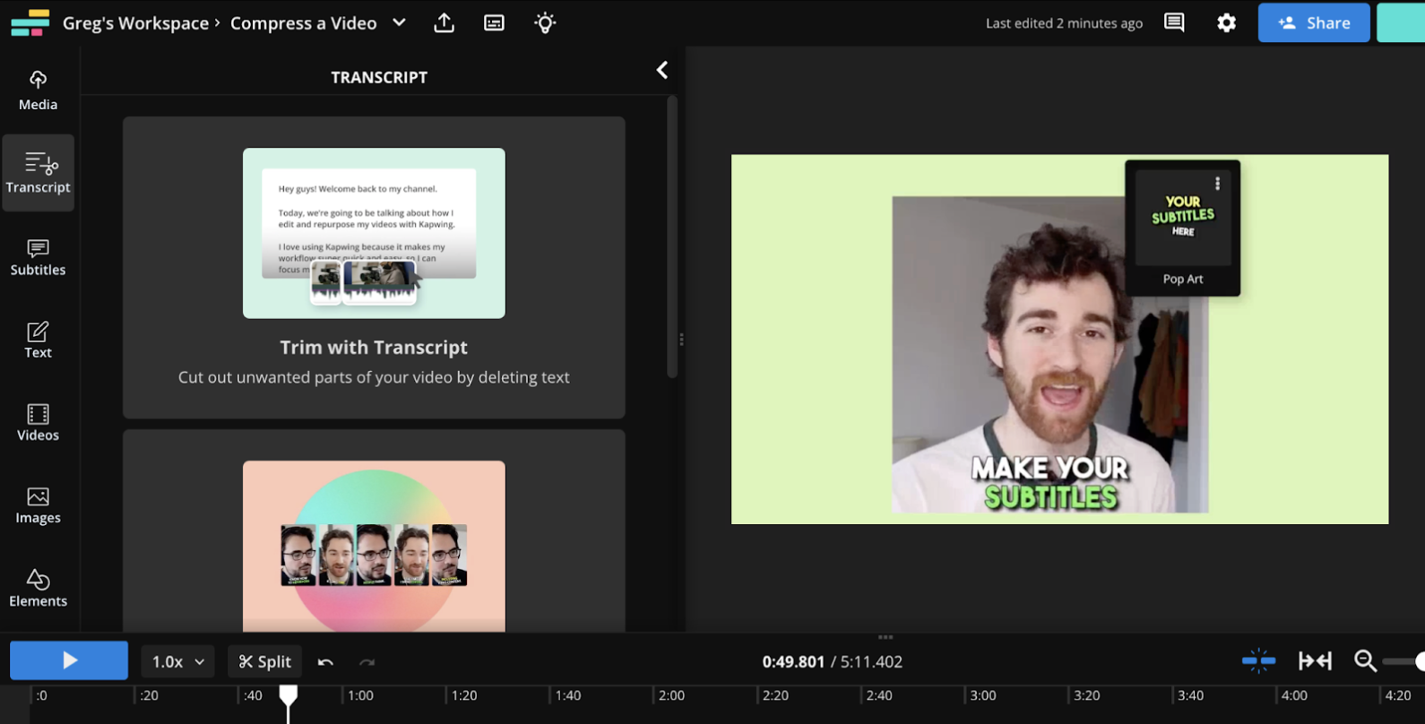 Step 2: You have two options to trim your video: (1) Edit the video with Kapwing's traditional timeline video editor by using the Split Video feature and the drag-and-drop timeline markers, or (2) Create a transcript automatically and use Trim with Transcript to edit the video like a text document.