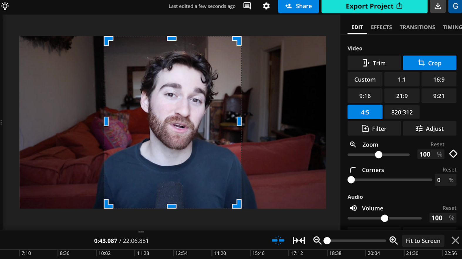 To edit your video this way, head over to the Kapwing editor and select the "Crop" tool. You'll be able to choose from common aspect ratios on social media or drag and drop to find the perfect size for your video. Try to keep all of your footage in frame while removing any padding on the top and sides; this is an especially useful approach if you're sending a video internally or to someone you know.