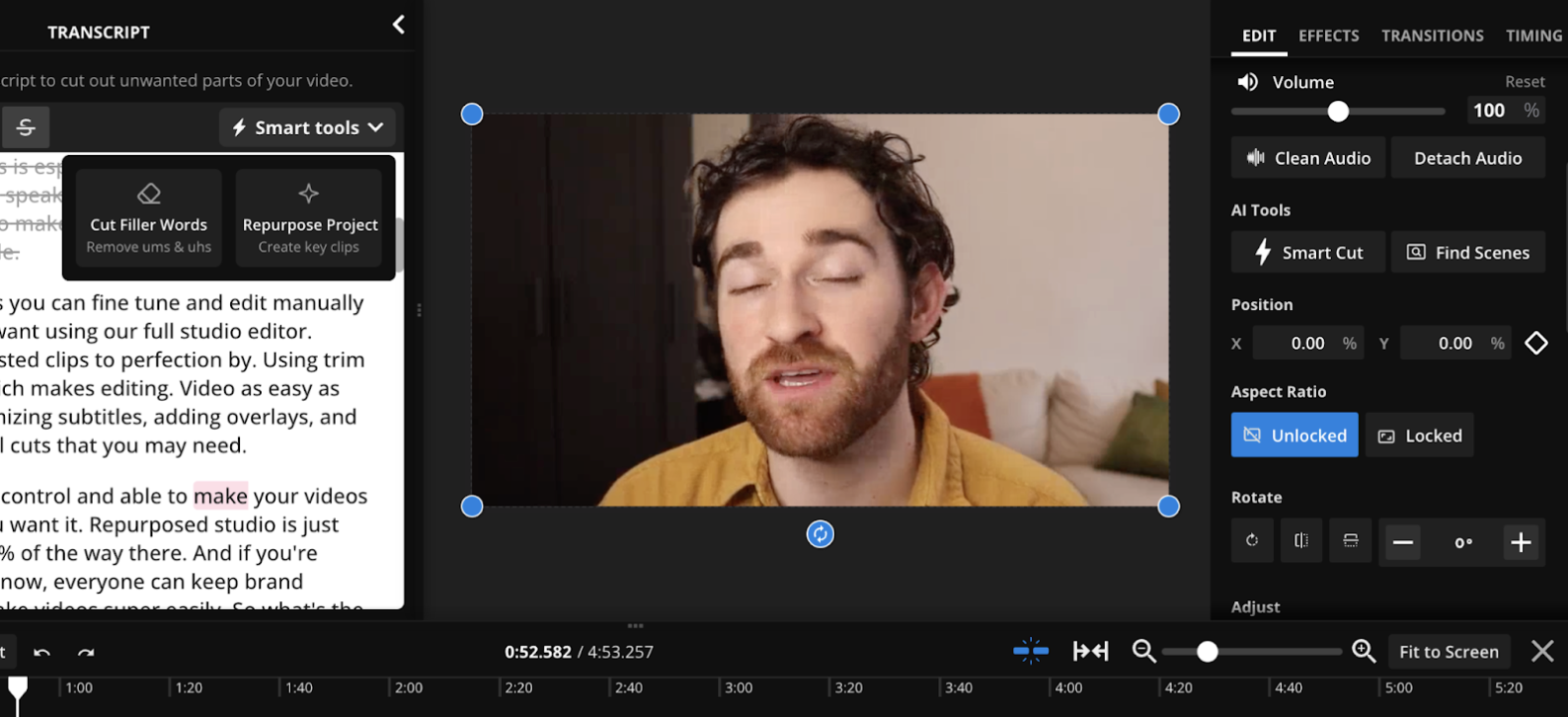 From here, you can find sections in your transcript that you'd like to shorten or remove entirely. You can also speed up this step with Remove Filler Words, a feature within Trim with Transcript that automatically removes "ums, uhs" and other filler words. Just click on Smart tools → Cut filler words to get started.