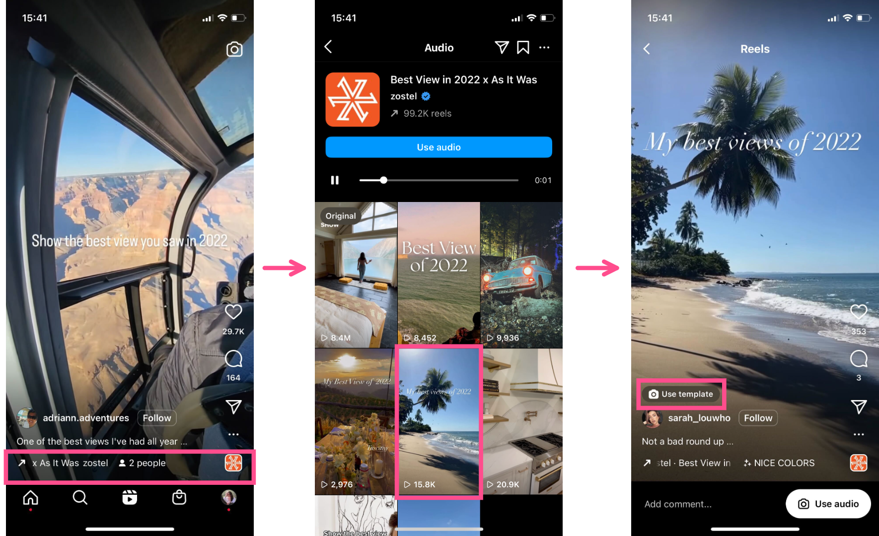 I was able to easily find multiple Reels with templates from this trending "Best View in 2025" audio by Zostel even though the original Reel I saw the audio on wasn't a template.