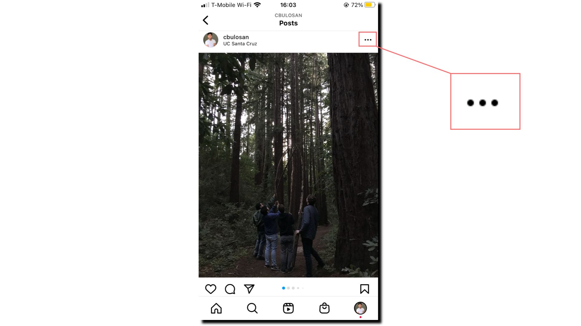 Once you've found the post you want to pin to your Instagram profile, tap the 3 dots icon in the top right of that post (⋯).