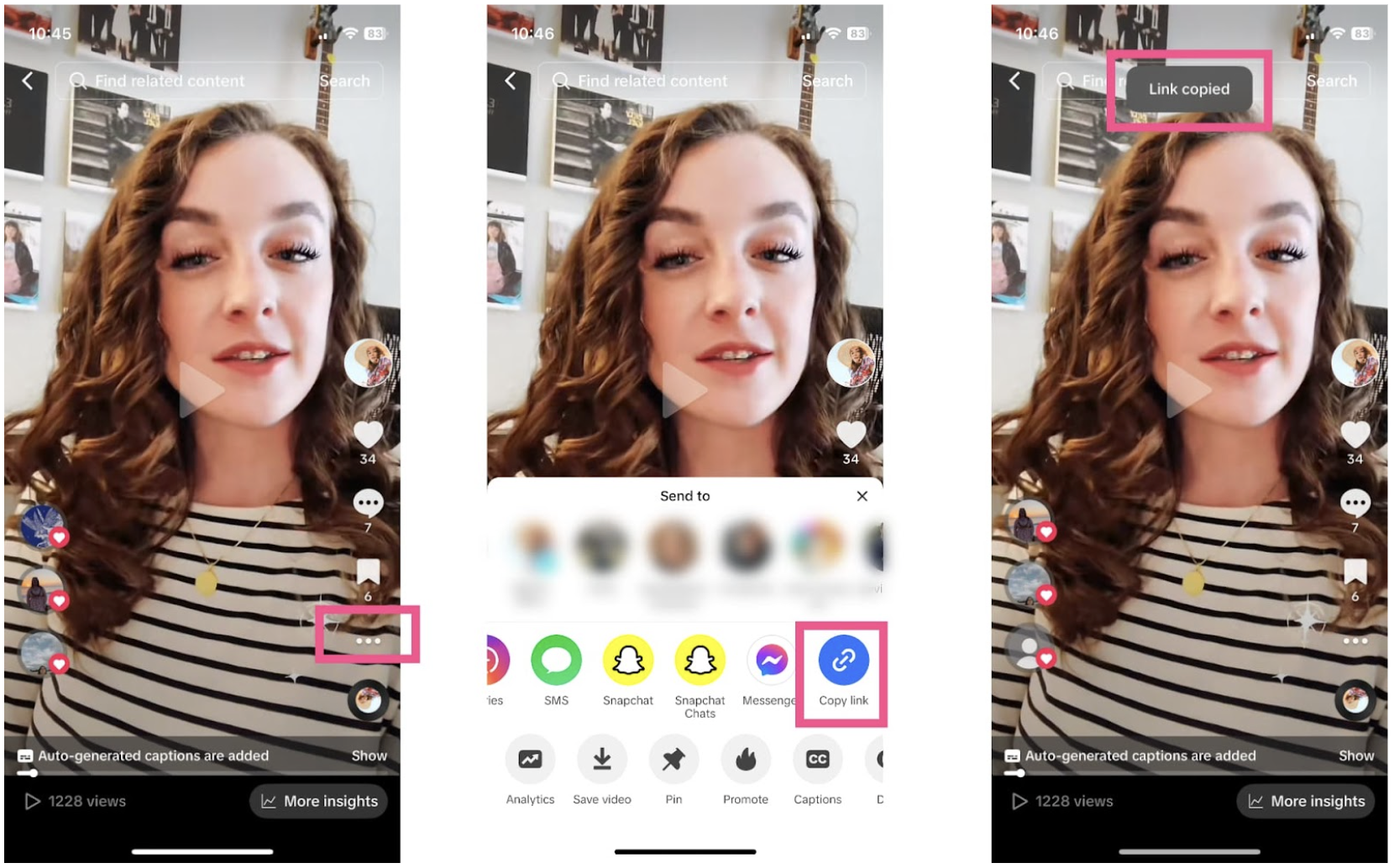 The best way to share someone else’s TikTok on Instagram is by using TikTok’s built in sharing feature. TikTok adds a watermark, so you can credit the original creator and your viewers can go back and find more of their content.
