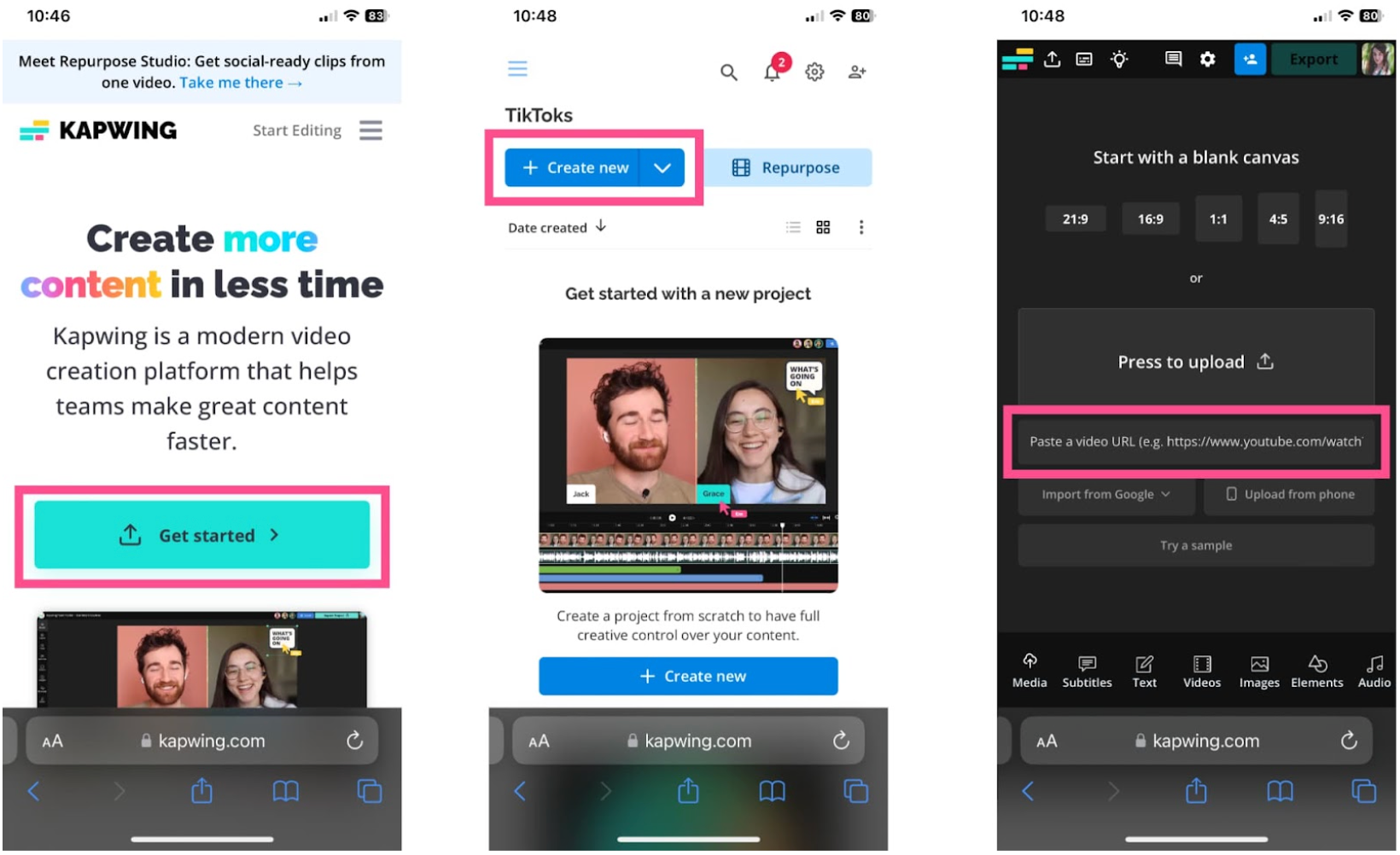 Head to Kapwing.com on your mobile browser and open a new project. Paste the TikTok link you just copied into the upload window that says “Paste a video URL.” It may take a few seconds to load.