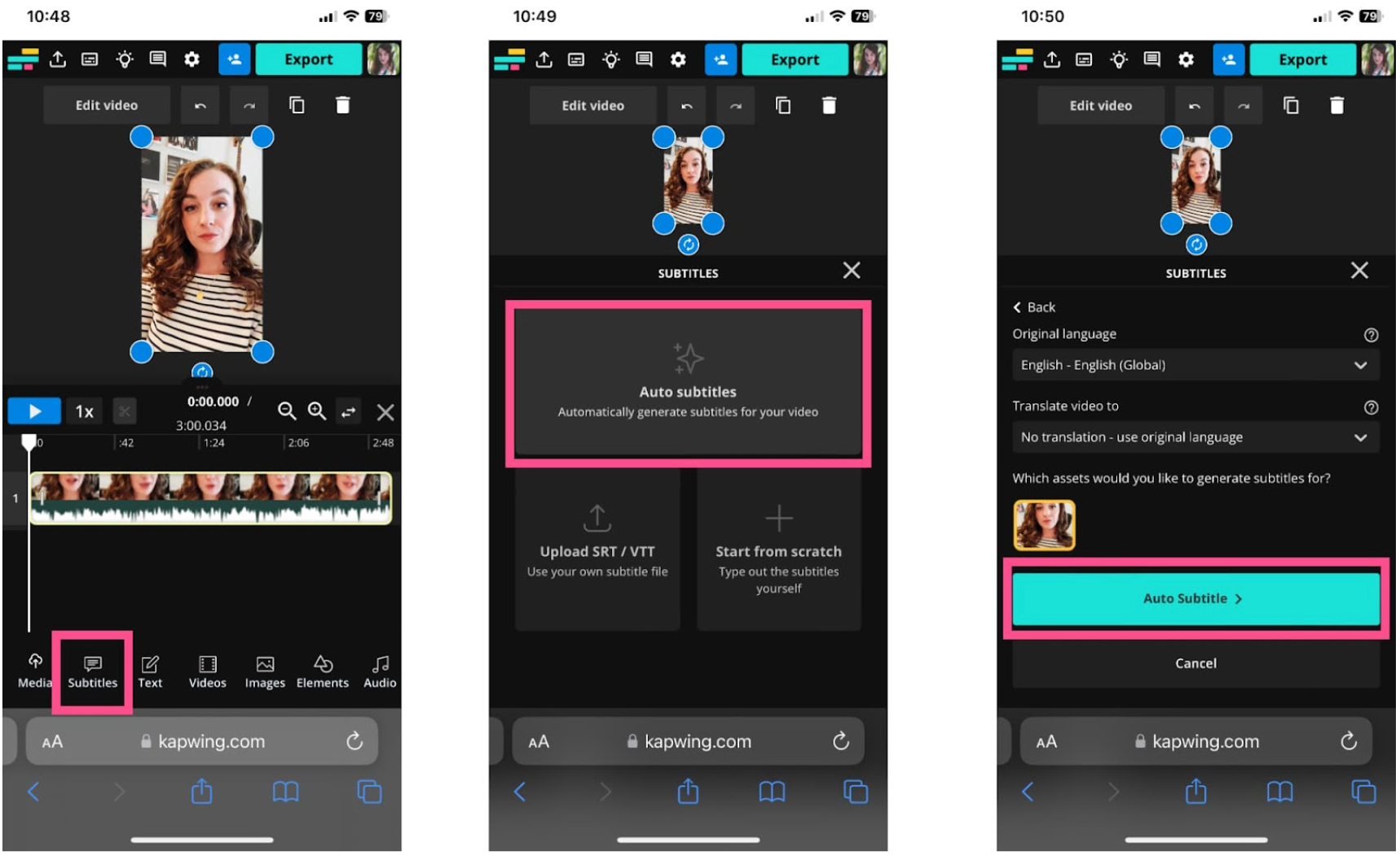 Tap on the “Subtitles” tab in the menu at the bottom of the screen to open the auto-subtitle generator. Choose “Auto subtitles” from the subtitle options. Set your subtitle language so that it matches the language you’re speaking in the video then tap “Auto Subtitle.” It may take a few moments for the subtitles to generate.