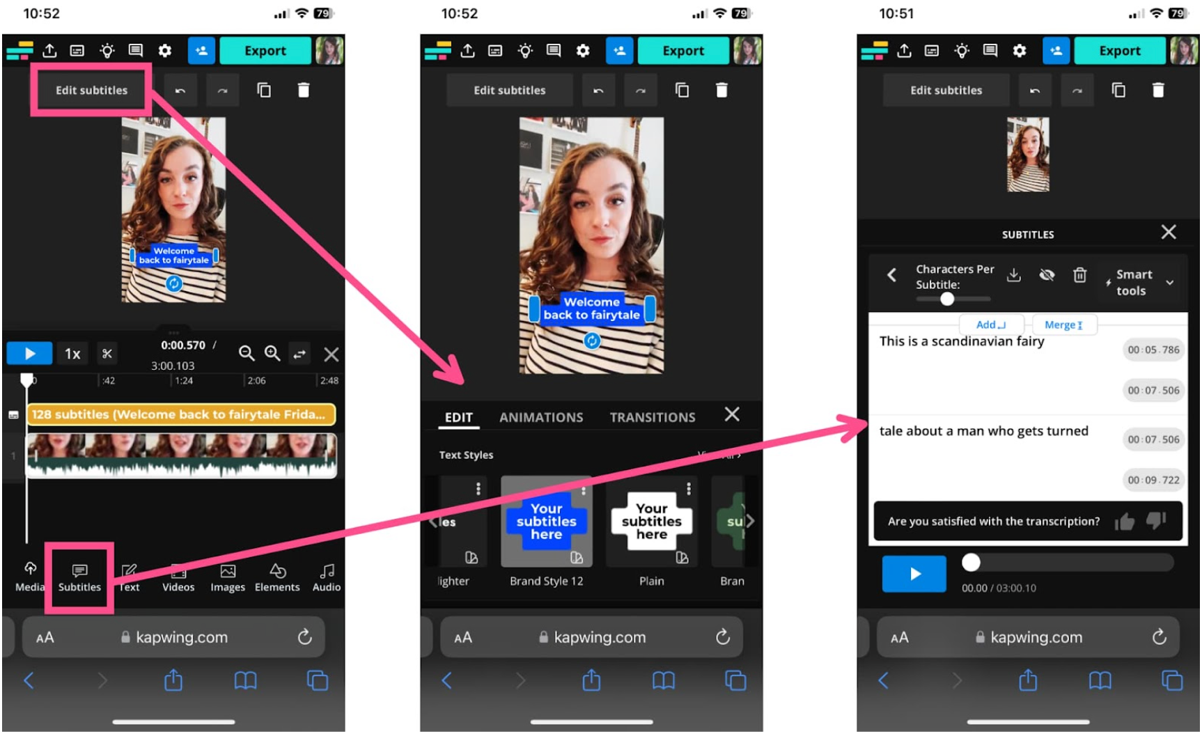 Once they’re ready, you can change the subtitle font, style, animations, and size. Tap the “Edit subtitles” button at the top of the screen to do so.