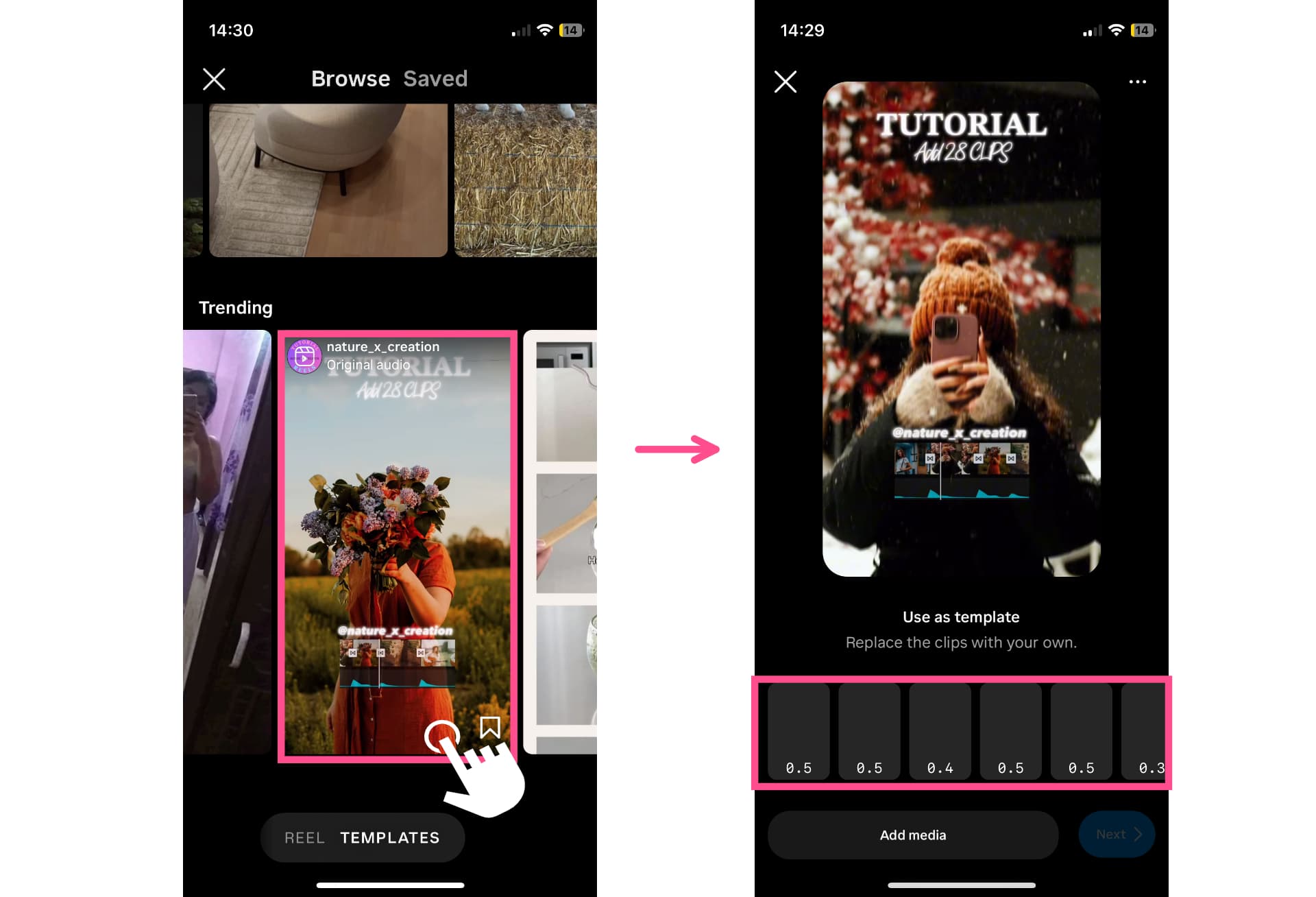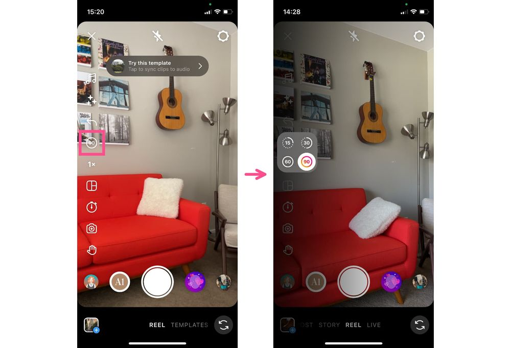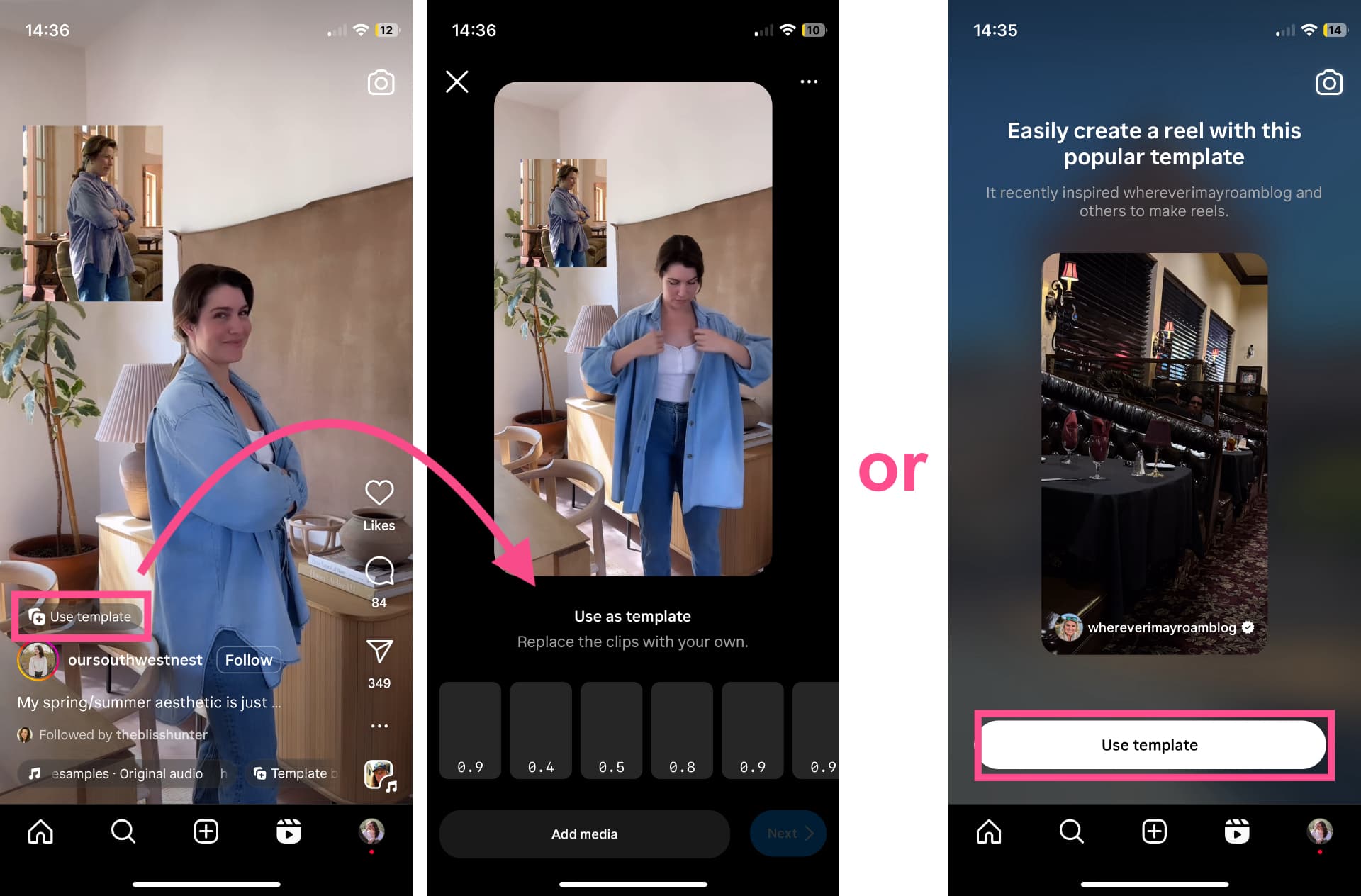 You can also find Templates while browsing in the Reels feed. Simply browse Reels as normal but keep an eye out for posts with the “Use Template” button on them. To create your own Reel with that template, tap on the button and the Template editor will open.