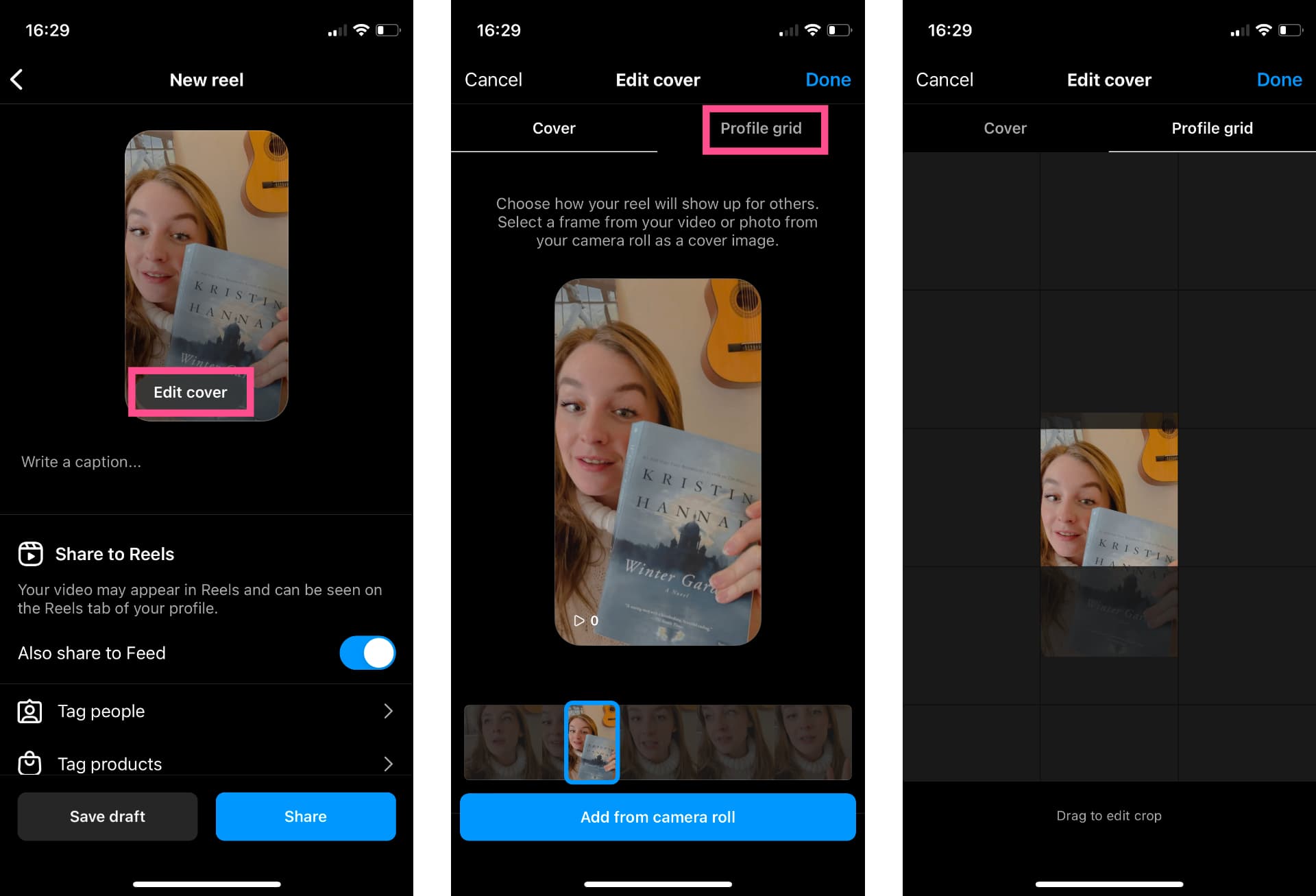 Because Reels are 9:16 and the grid is 1:1, we recommend customizing your cover image. You can upload an image from your camera roll or simply select a frame from the video to set as the cover image, then adjust the crop to make sure the most important parts of the thumbnail will be visible in the grid.