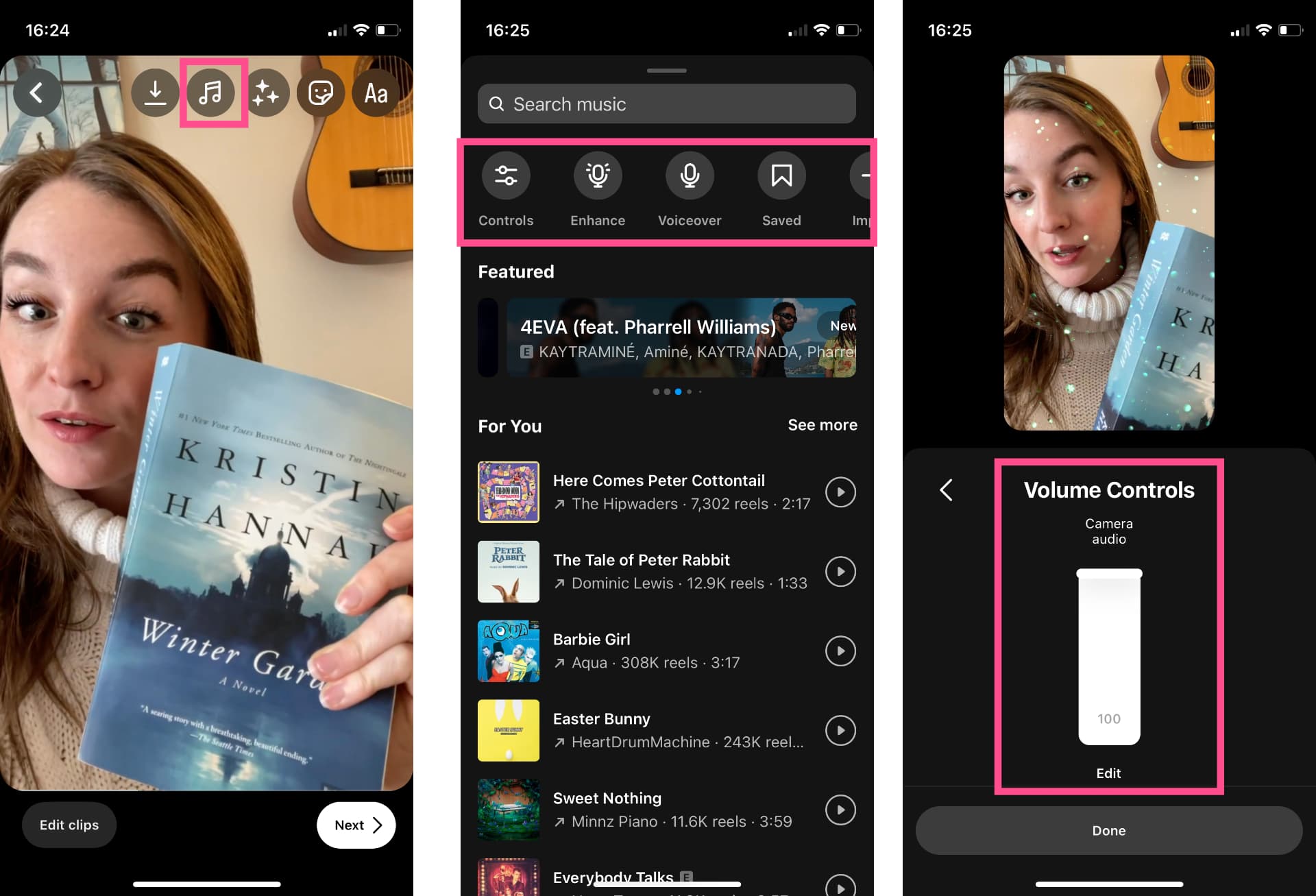 In the Reels editor, you will be able to add many of the same features from before as well as some new features, like voiceover recording and volume controls.