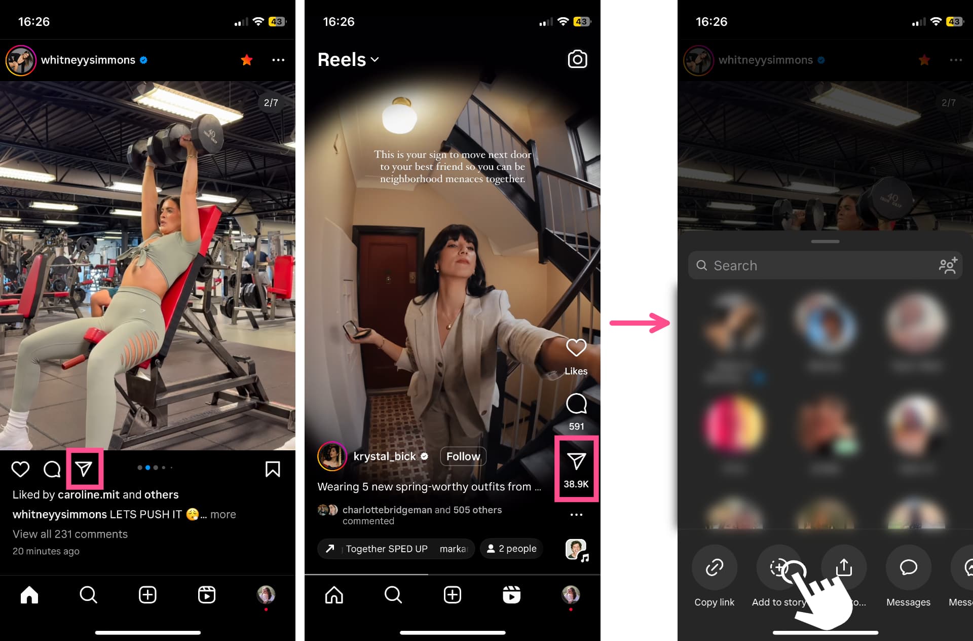To share a video from your Feed or Reels to Stories, simply tap on the share button on the post. On a Feed post, this will be below the video. On a Reel, it will be in the icon menu on the right side of the screen.