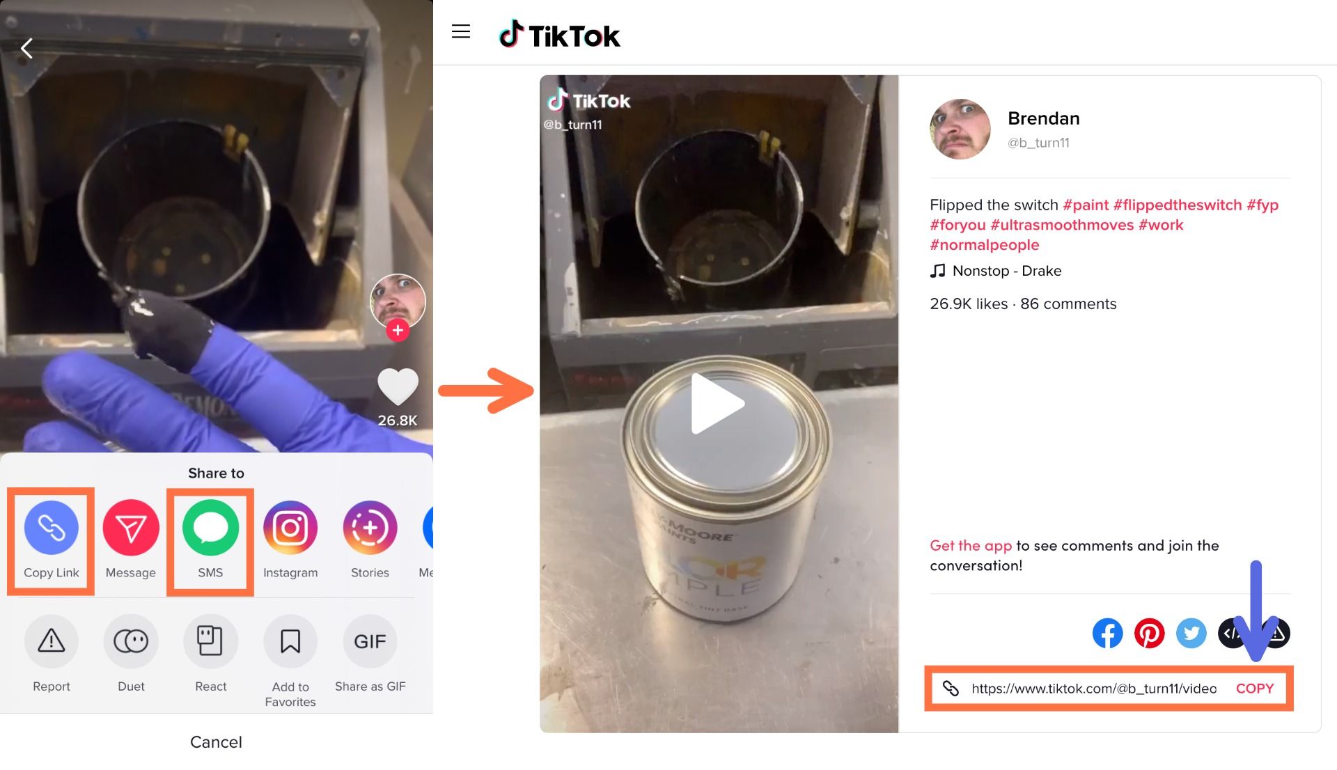 If you want to repost a video from TikTok from a user who has disabled downloads, they've recently made it slightly more difficult, but it's still pretty easy. You'll have to go to the video on your web browser – send the link to yourself and open it on your computer. To the lower right of the video, you'll see a URL with "Copy" next to it.
