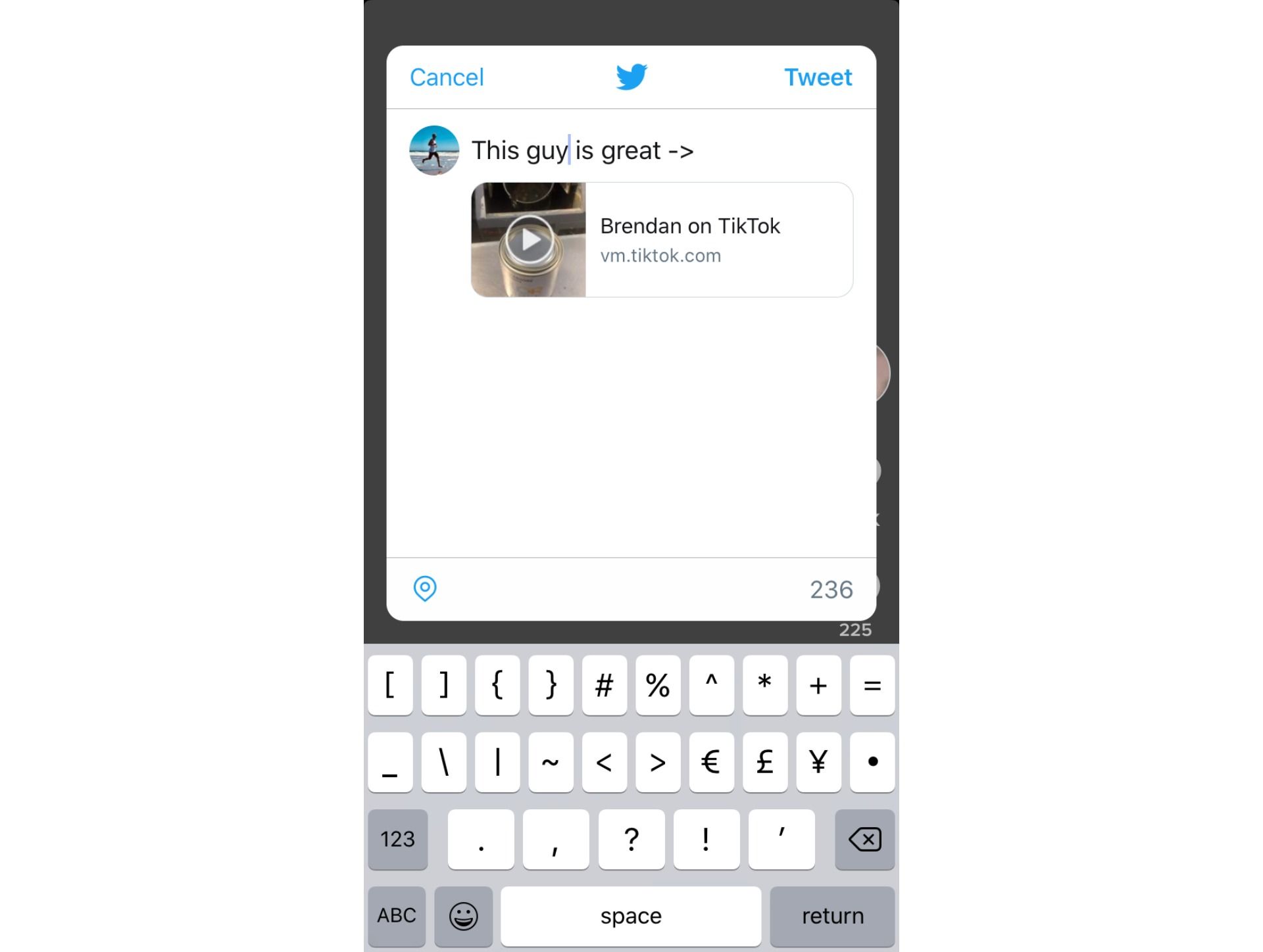 Now that your video has been saved to your camera roll, it takes just a couple seconds to post on Twitter. Open your Twitter app and hit the Compose Tweet button – it looks like a feather with a plus sign. You'll see your most recent camera roll items above your keyboard, and you can select the video you want to share directly from here. Or, if you've already started composing your tweet, select the Photo/Video button and choose the TikTok video from your camera roll – the button is on the left edge, just above the keyboard. Hit "Tweet" and your video is shared!