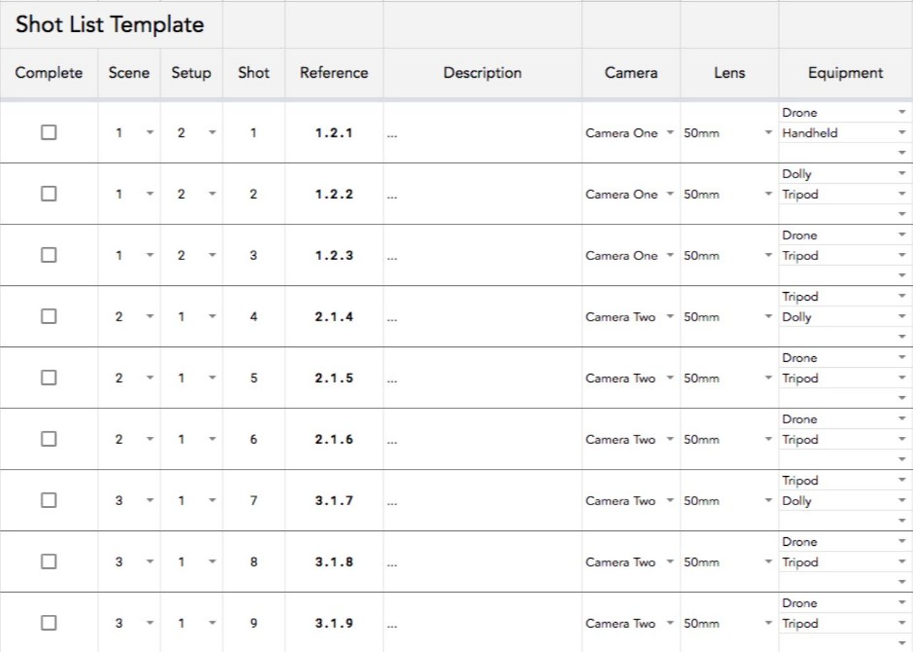 Will you be filming in multiple locations? Add those locations to your shot list and nest the relevant shots under those headers. You wouldn’t want to wrap filming at a location only to realize you’ve forgotten to get one or two crucial shots because they were at the bottom of your shot list.