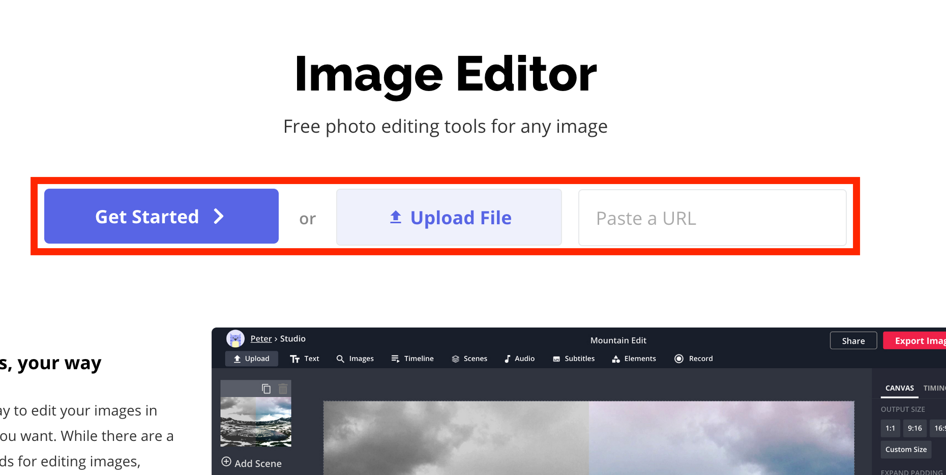 Head to the Kapwing Studio, which will show you three options for importing your screenshot: Get Started, Upload File, and Paste a URL. Get Started allows you to start from scratch, Upload File will upload any file from your hard drive, and Paste a URL will let you post any picture’s URL from the internet.