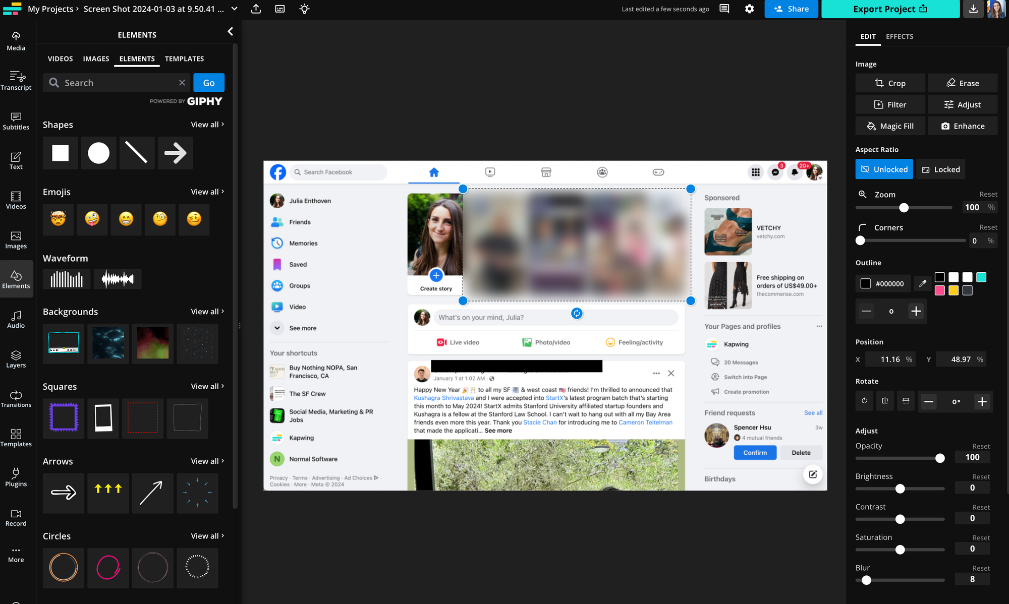 When it has been edited to perfection, look to the top-right corner and click on Export Project and export as a PNG or JPEG, two different image formats. This will start Kapwing's processing so you can download your edited picture.