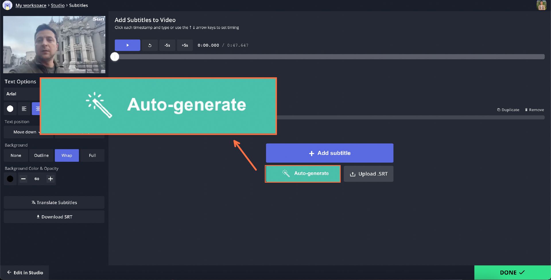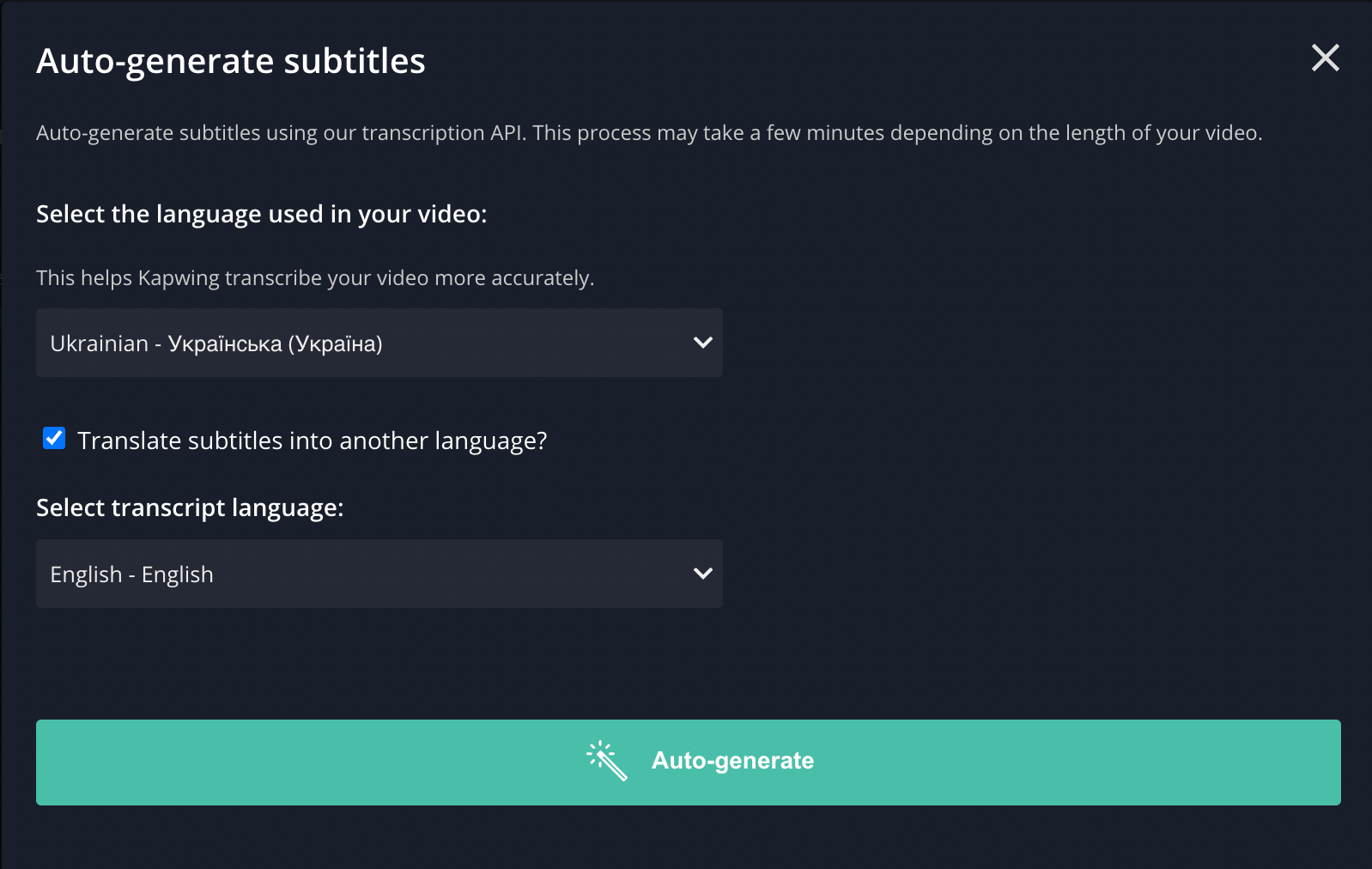 After you've selected the correct languages, hit "Auto-generate" to process and translate your video from Ukrainian to English or Russian to English. Once you've translated your video, you can customize the subtitles to your desired placement, font, color, etc.