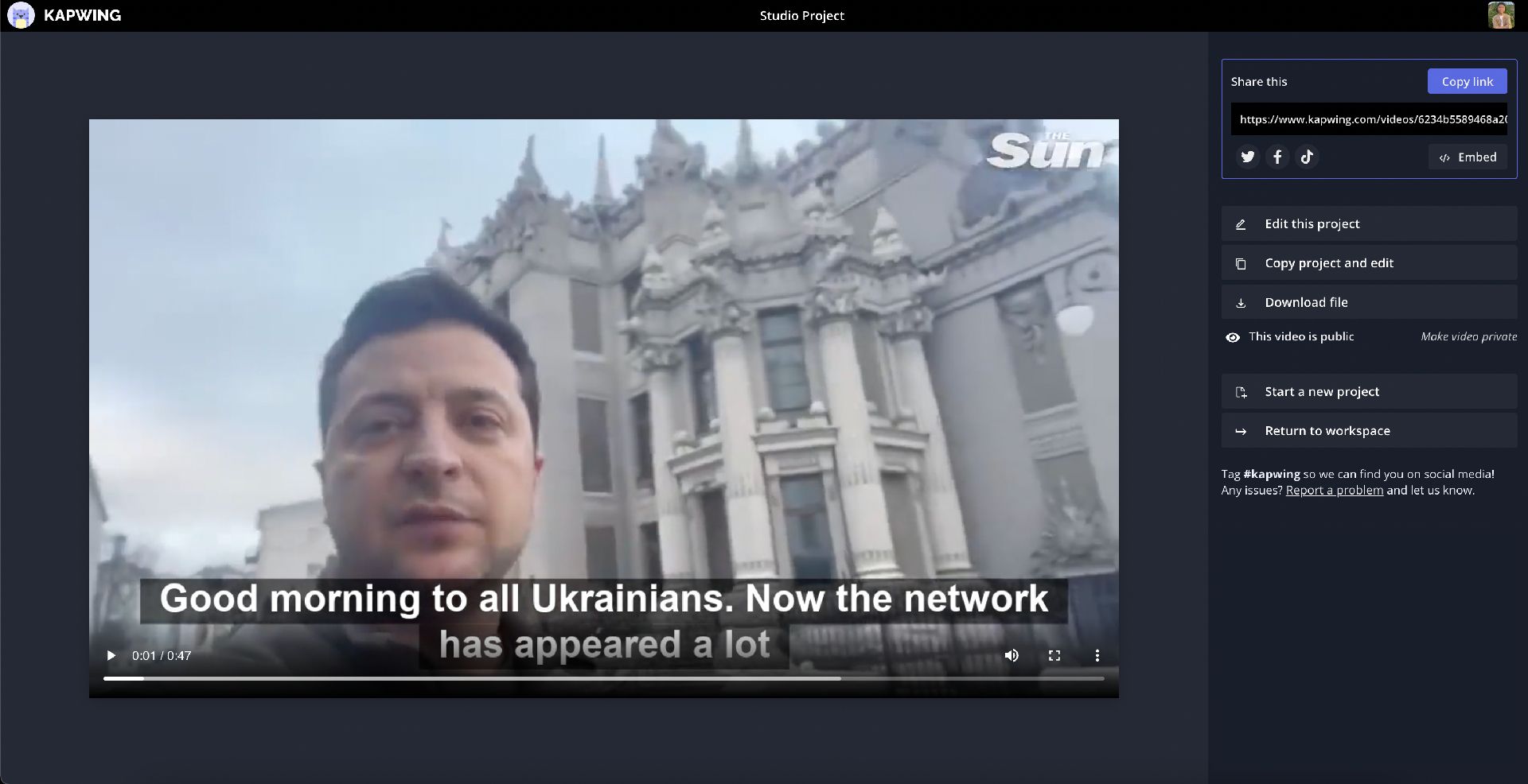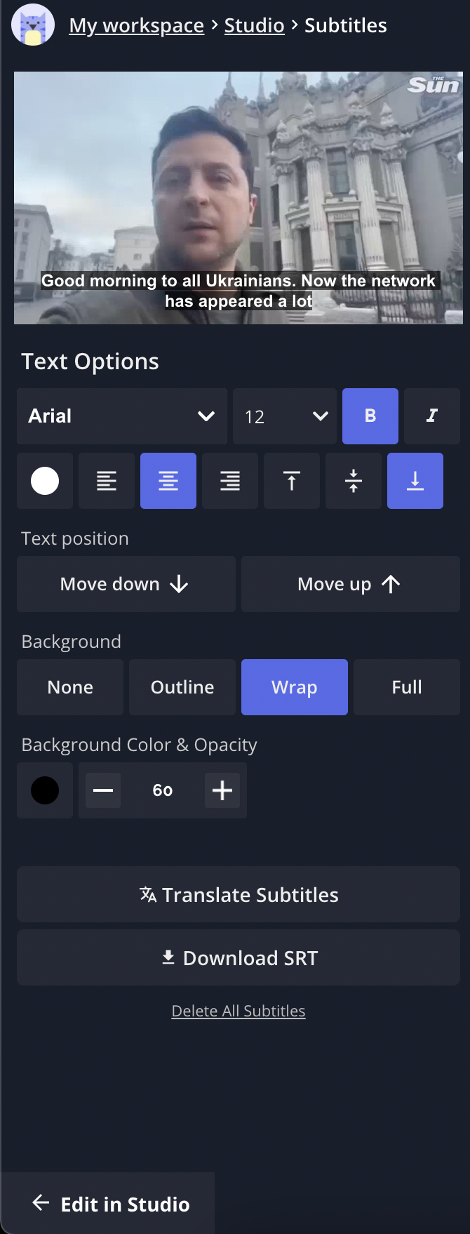 Kapwing automatically generates the subtitles at a size 18 font, so I minimized it to the standard 12 to not cover the Zelenskyy in the video.