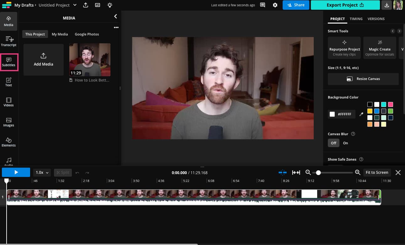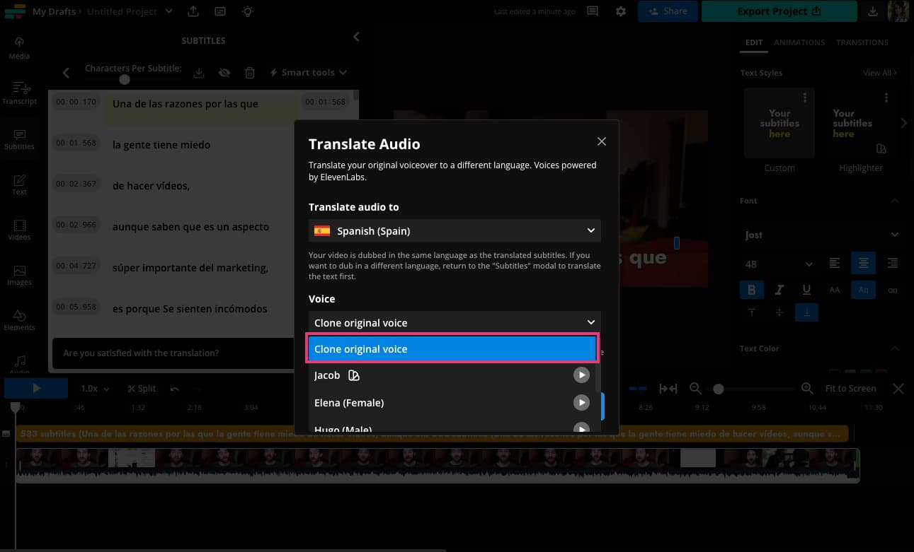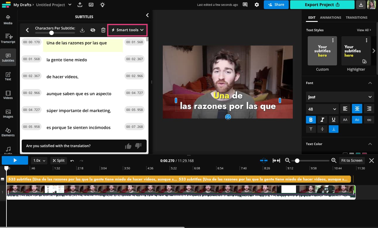 If you’re translating your own videos to share on YouTube or elsewhere, you can make any other changes right there in the editor—customize the subtitle font and styling, add new title cards and overlays, or even repurpose the video into clips for social media.