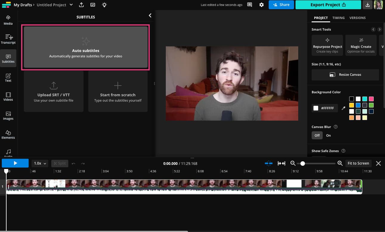 Click on the “Subtitles” tab in the left-side tool menu. This is where you can add video subtitles manually or auto-generate them based on your video's audio.