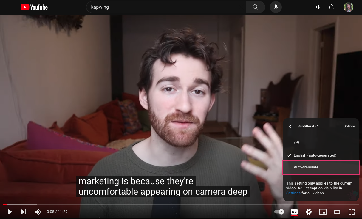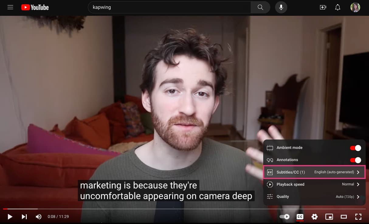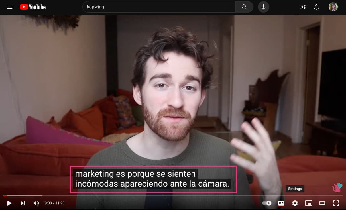 Note: If the video you’re watching doesn’t have the CC button or if it’s grayed out, that means closed captions have not been enabled for that video. Jump ahead to see how to translate YouTube video subtitles with Kapwing or dub the video.