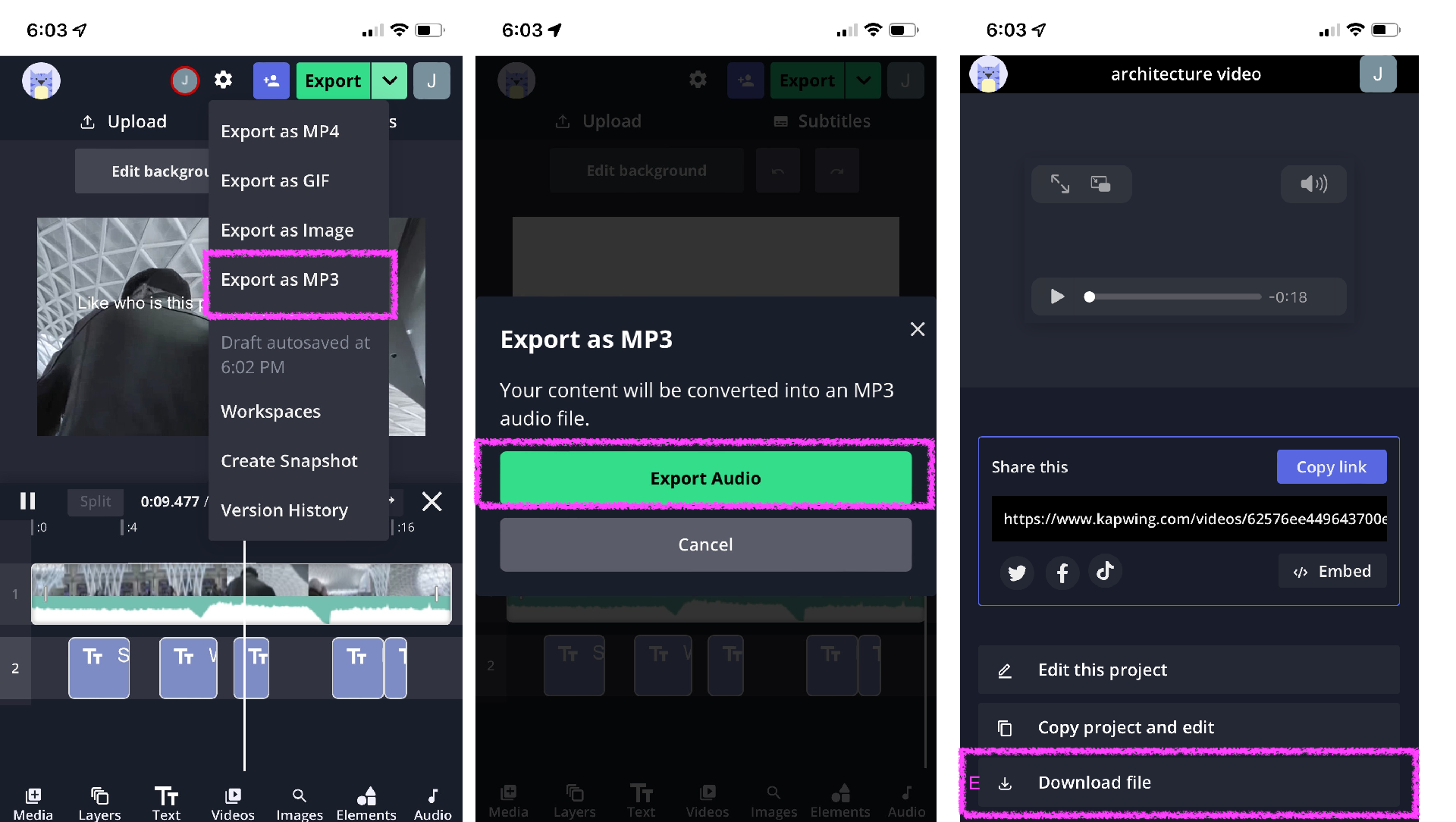 When you're happy with the audio, you can choose to export the Siri voice as an MP3 (audio only file) or as an MP4. Tap the dropdown arrow next to the Export button to choose "Export as MP3" instead. After you confirm, Kapwing will process your video and give you the sound file of your siri voice.