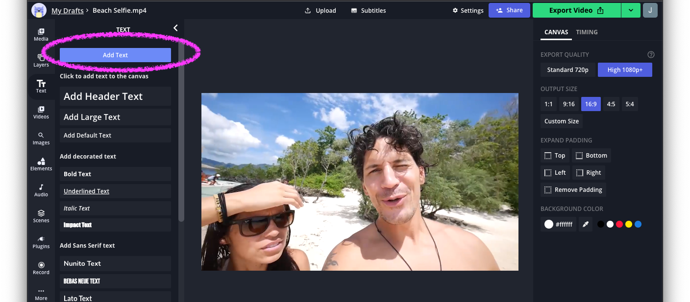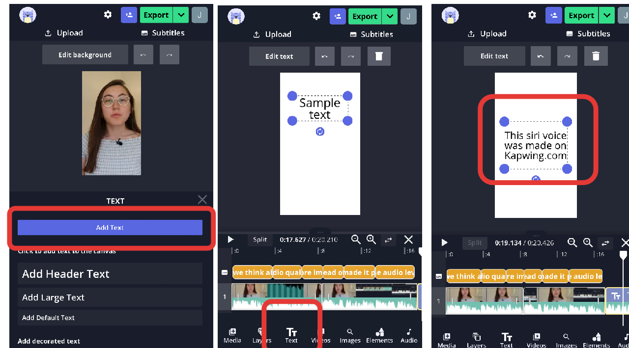 Head to the Kapwing website and click "Get Started." You can choose to upload a video or import a video layer from YouTube, or you can start from scratch if you want the stand-alone siri voice. Then, use the Text button in the left side menu to add a text layer.