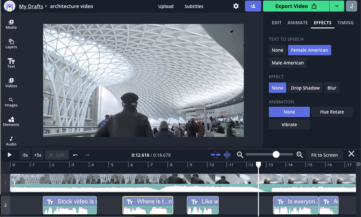 Once you've typed the words that you want to say, select the text layer. In the action menu, you will see a prominent button that says "Text to Speech." Use that button and choose a voice - "Female American" or "Male American" - to make your text layer into a Siri voice layer.