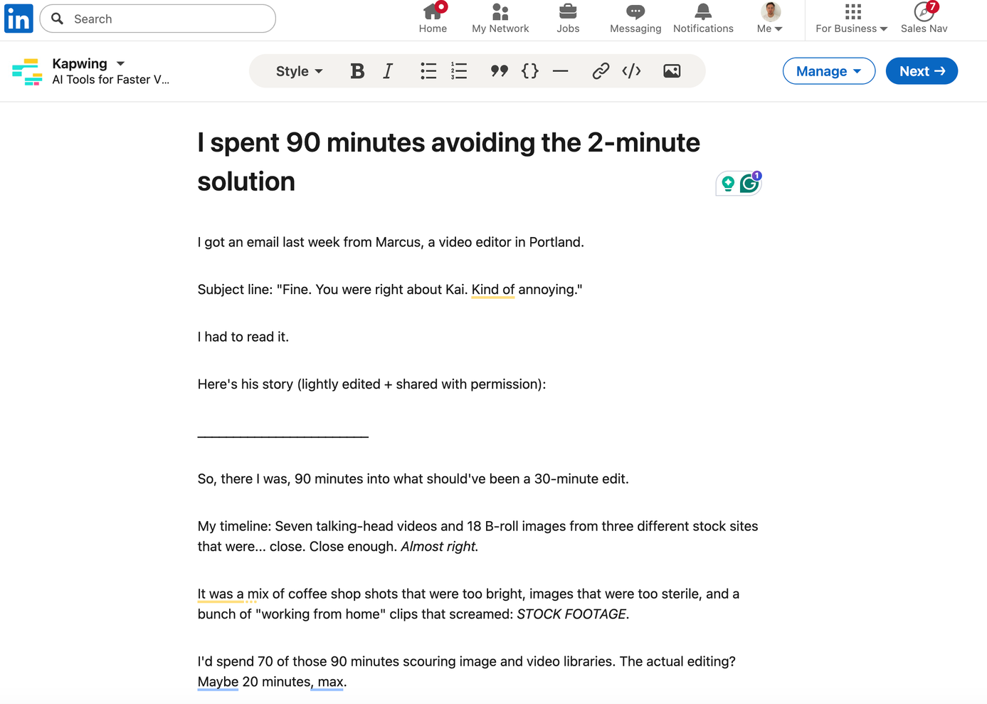- Hook with a Mental Movie: Start with a specific, relatable scene. I depicted the Kapwing mascot, Bob the Cat, walking into the office muttering about AI tool overload. This approach is far more engaging than a generic product statement or flashy hero image.