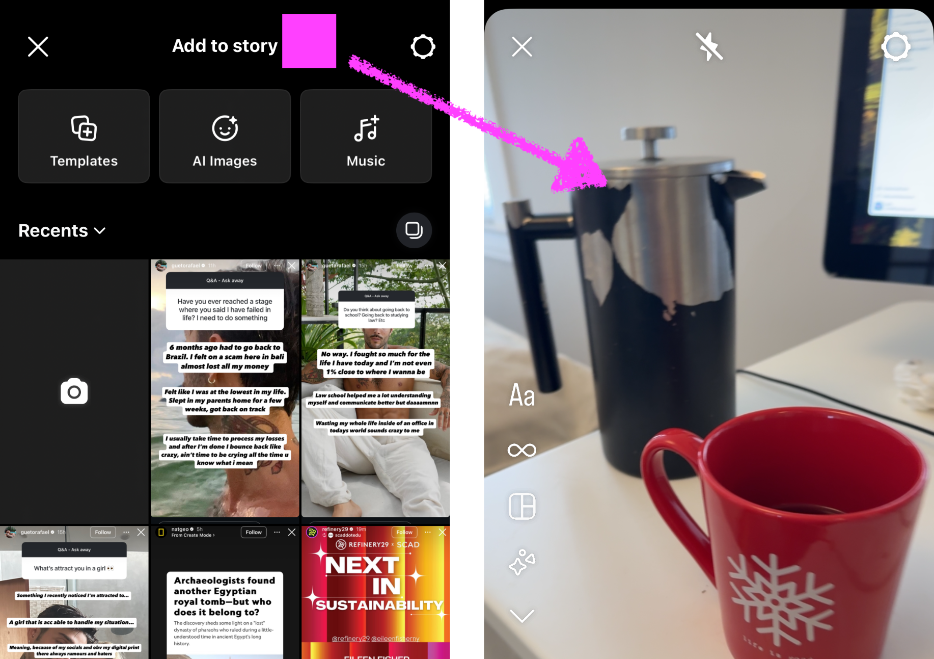 - Open Create: Alternatively, click "Add to story" at the top of the screen to enter Create mode, where you can type directly on your story. Choose from various background options, such as solid colors or gradients, to complement your text.