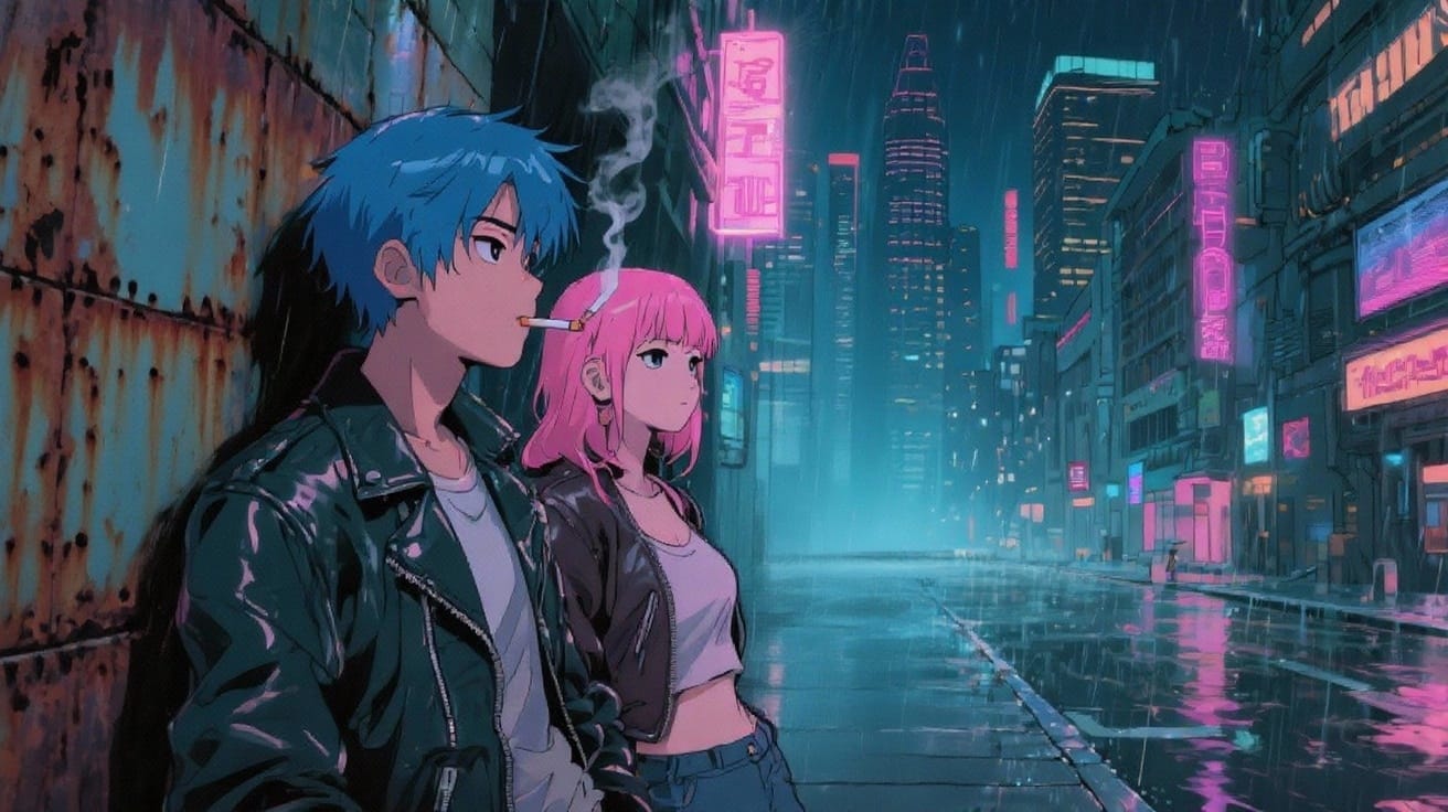 "A 90s anime-style cyberpunk city scene with two main characters - a girl with pink hair and a guy with blue hair. Retro-futuristic aesthetic, with neon lights and rain-slicked streets. The blue-haired and pink-haired characters will be leaning against a rusted metal wall, smoking. The lighting emphasizes the neon glows reflecting off wet pavement, and the characters have that classic anime facial expression—slight smirks, half-lidded eyes.