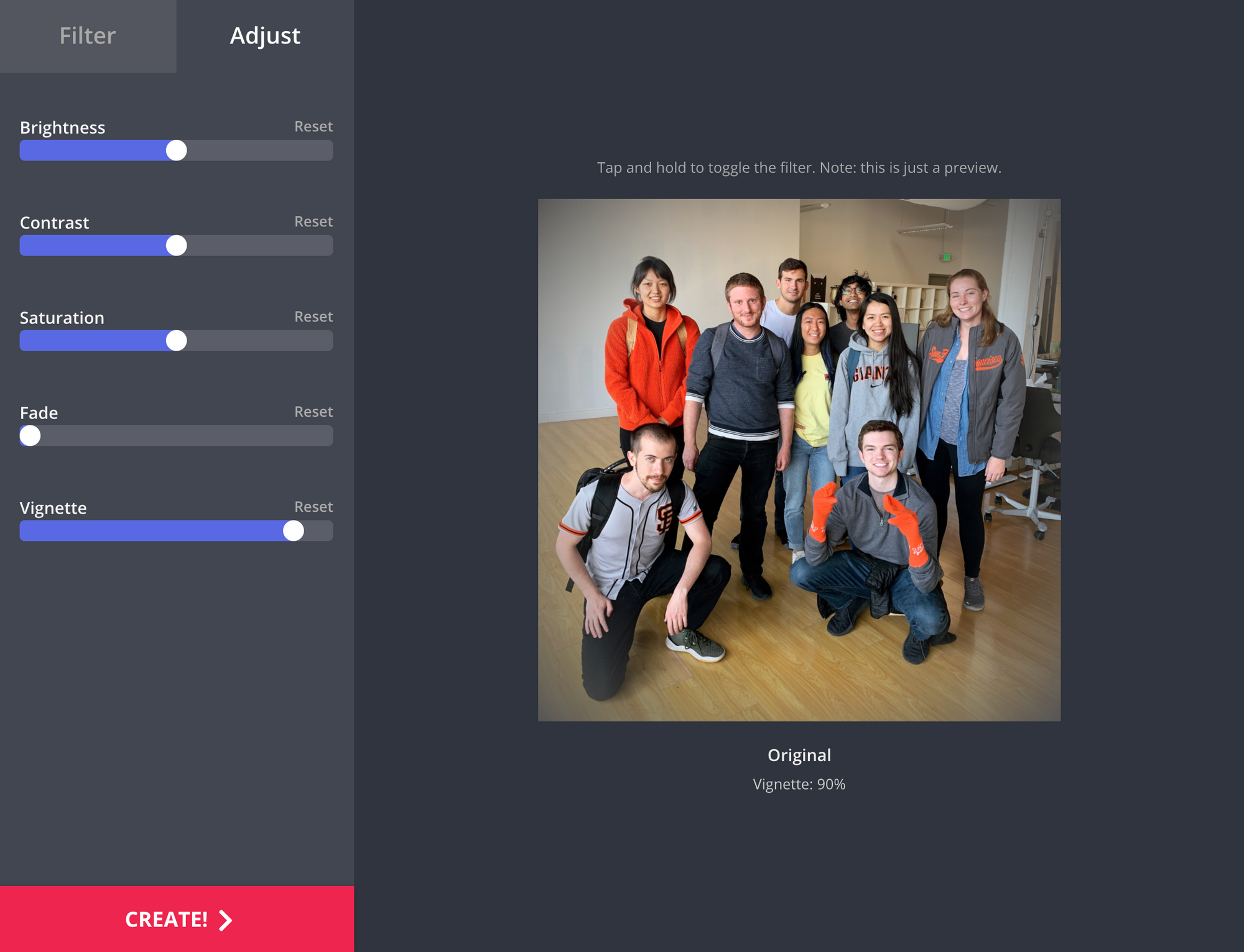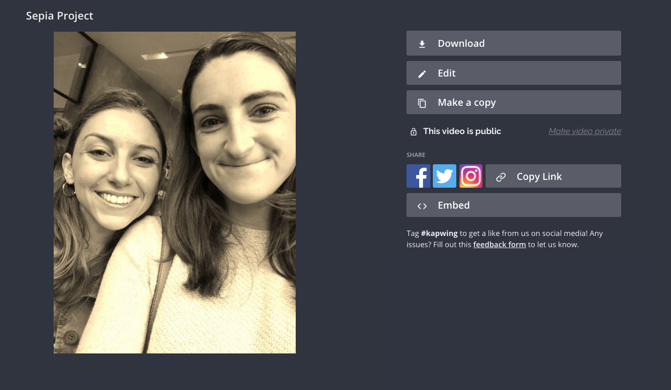 Filters and Colors: Adjust the colors in your video using drag and drop sliders. Increase the brightness, saturation, blur, and contrast, apply a sepia or black and white filter, or choose from other pre-set options. We’re planning to add more color effects in the future too!