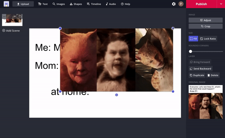 After your meme looks right, click “Publish” in the upper right-hand corner of the Studio window. The "Kapwing kittens" will take a few moments to process your video or image.