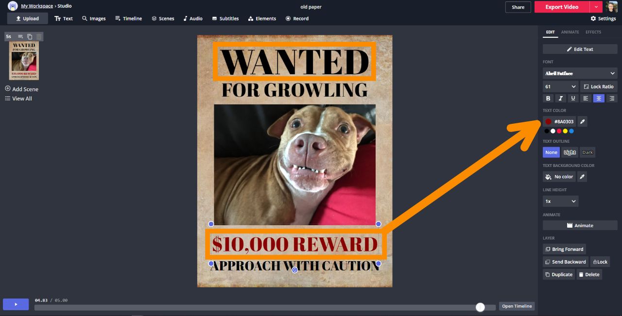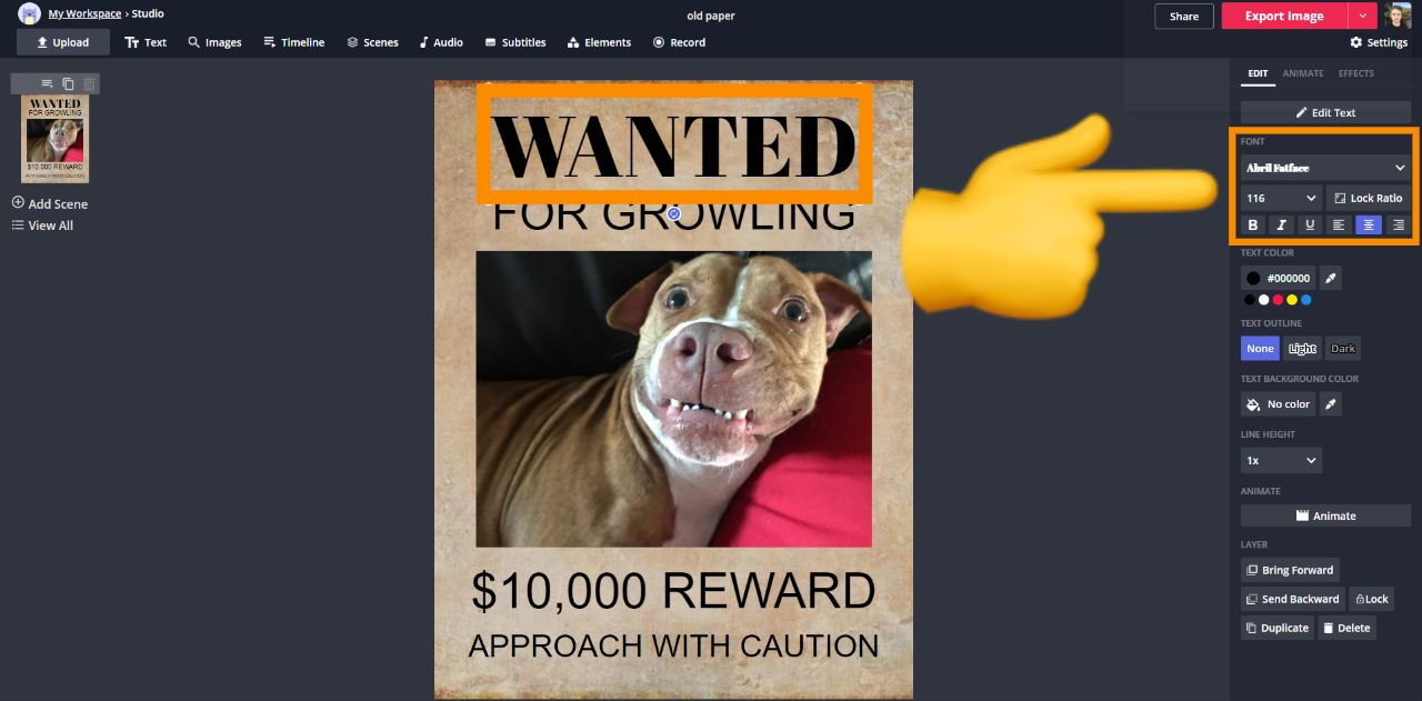 Once you’ve got the perfect font, start editing the text format, color, outline and background with the right side menu. The design is totally up to you but remember to use big text and bold colors that’ll stand out once they’re posted. In particular, you might want the “wanted” text to be the biggest font and the “reward” to have a high contrast color to draw attention once the reader takes a glance.