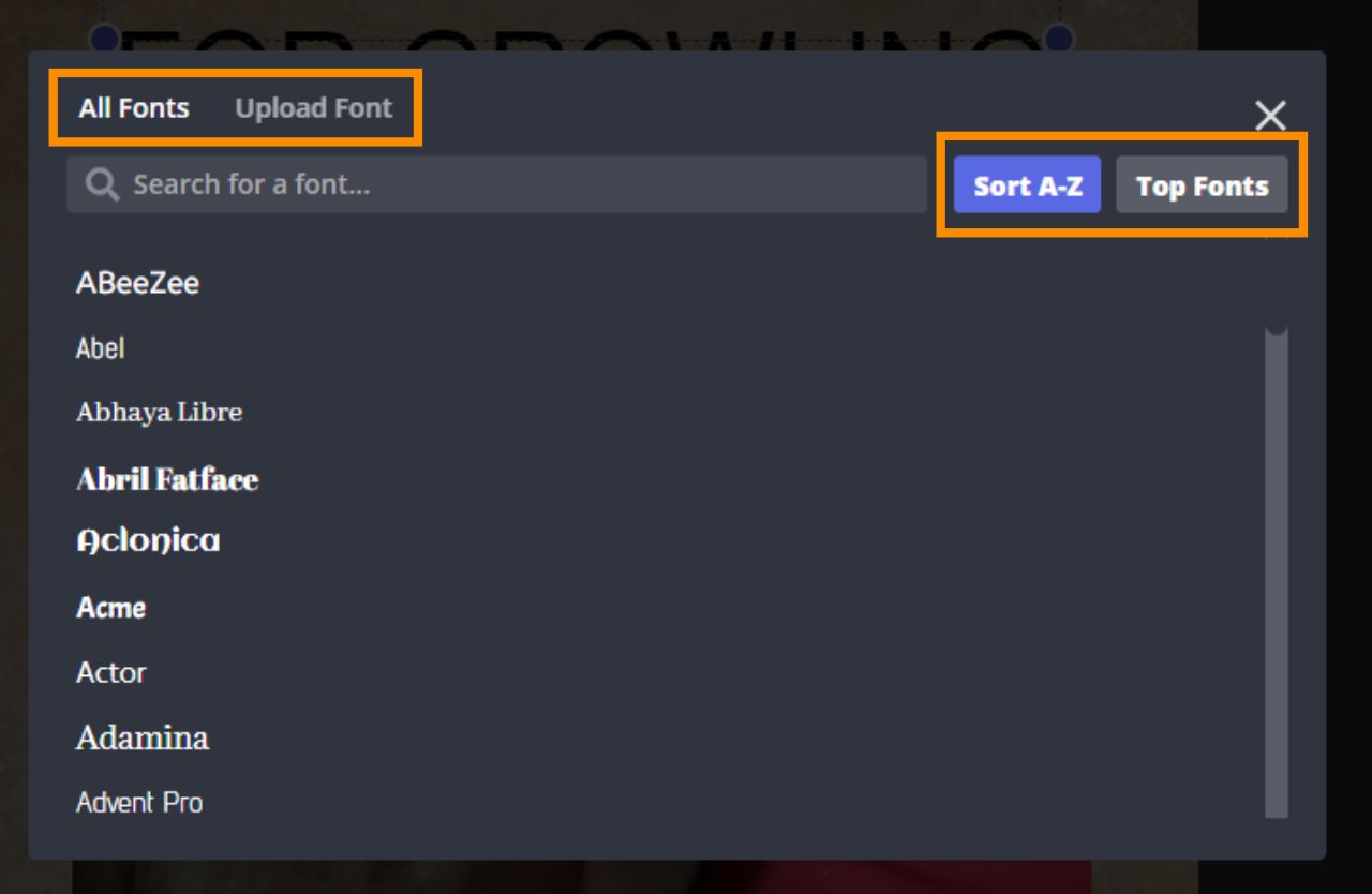 If you want more options, click ‘More Fonts’ in the font drop menu to search every font on Kapwing and sort from A-Z. There’s tons of great fonts to choose from that make it easy to read on a poster like “Helvetica,” “Raleway” or even “Permanent Marker.”