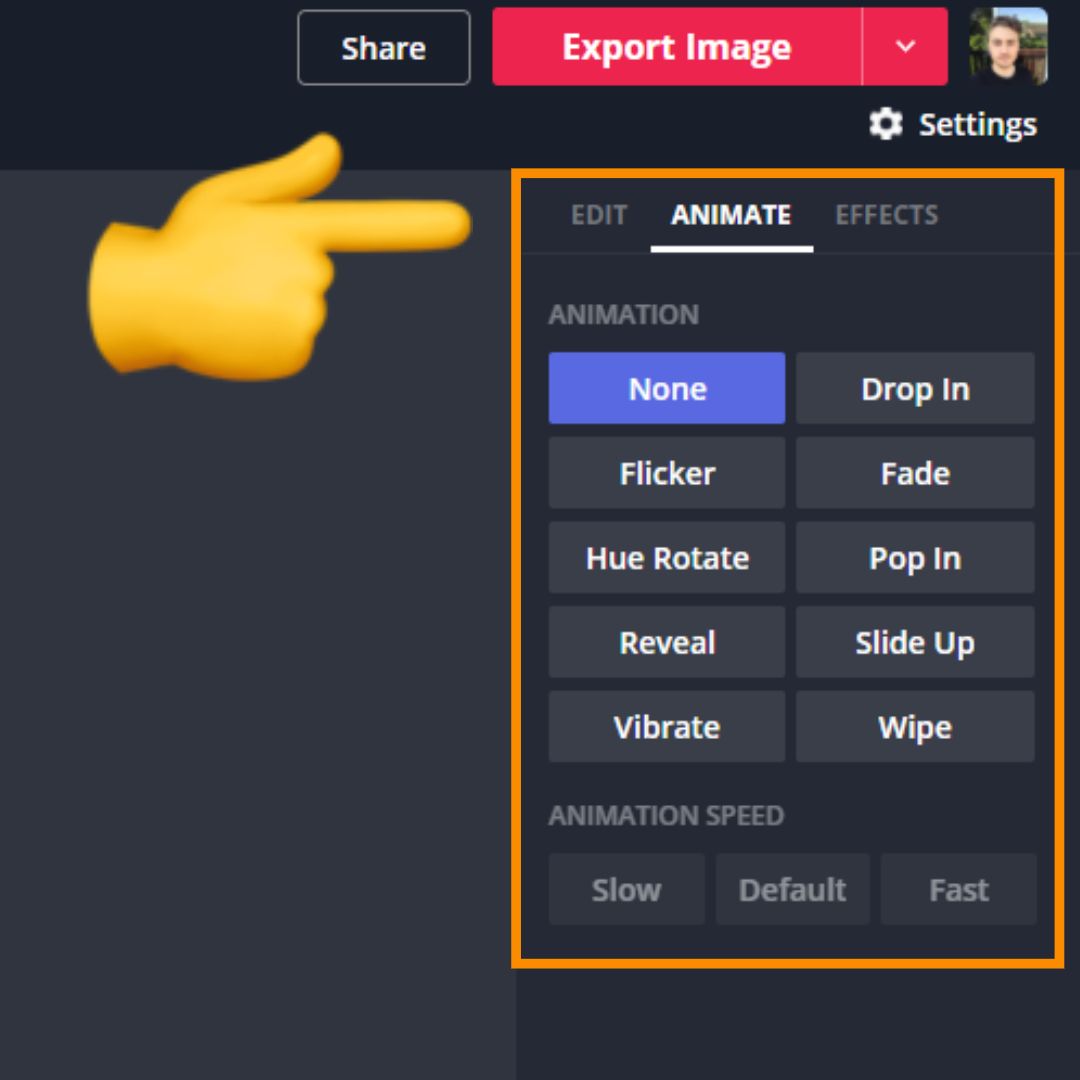 If you plan to use the poster online, adding effects will give you an edge that physical posters don’t have. To do this, click a text box or image and open the animate tab from the top right of the menu. Inside, you’ll see several options like flicker, fade and hue rotate to make your image or text come alive and demand attention.