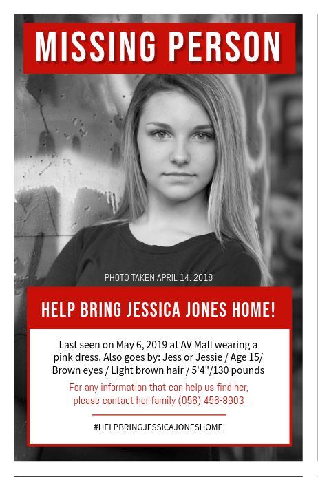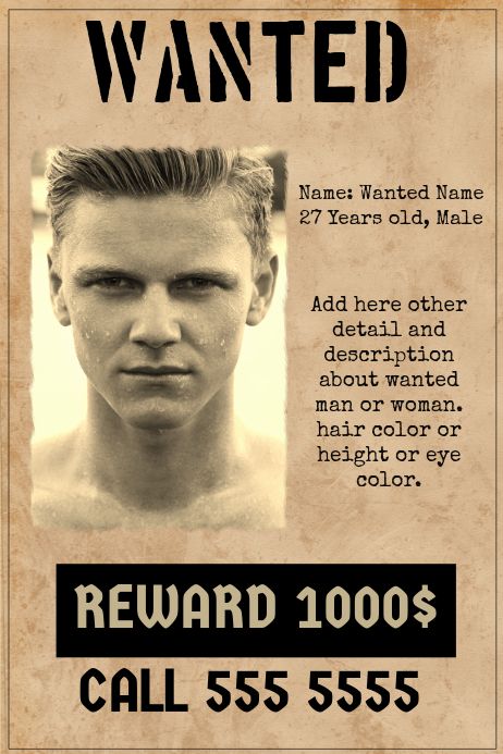 If your wanted subject has distinct physical qualities, a description layout is the way to go. Usually, this layout features a small portrait of the wanted individual next to a description listing things like height, hair style, eye color, where they were last seen, etc.