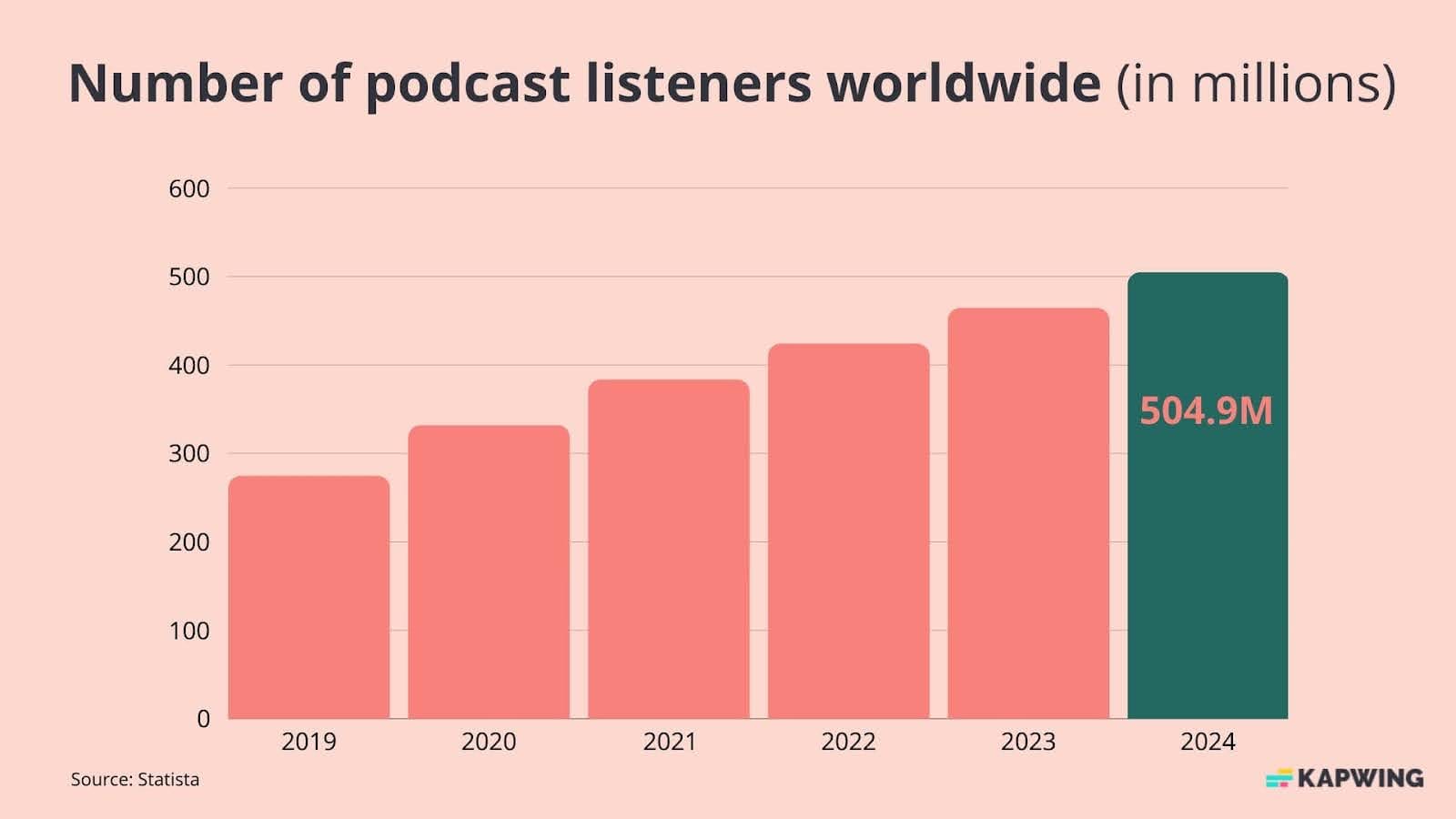 As of the end of 2023, there were 464.7 million global podcast listeners. By the end of 2024, there will be 504.9 million.