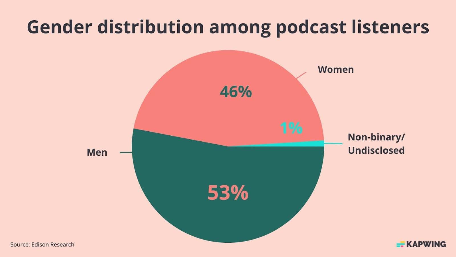 There are slightly more male podcast listeners than female listeners with women making up 46% of monthly podcast listeners and men making up 53%. The remaining 1% of regular podcast listeners are nonbinary or declined to disclose their gender.
