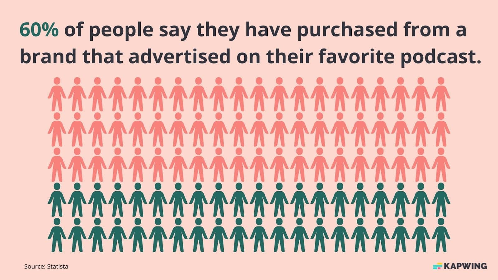 This is supported by data from Statista showing that the majority of listeners feel positively about podcast ads, describing them as “engaging, relevant, and memorable.” 40% of listeners said they go out of their way to support brands that advertise on their favorite shows and 60% said they’ve purchased from a podcast ad in the past.