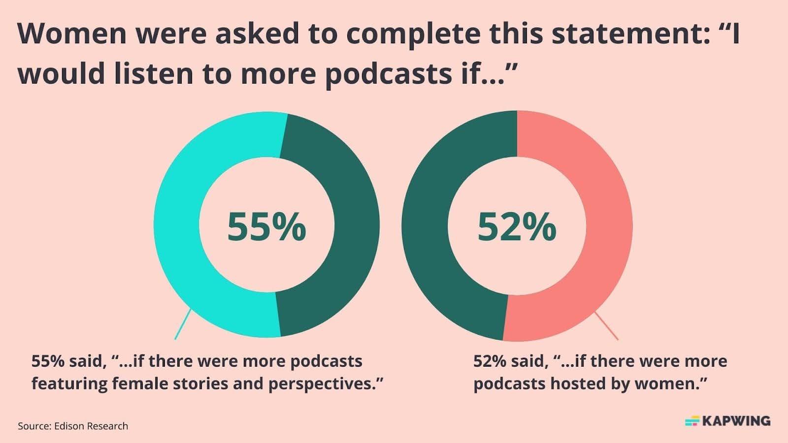 The untapped potential in female listeners is made even more apparent when we look at women’s listening habits compared to men’s. 90% of women listen to at least one female-produced or hosted podcast monthly. 55% of female listeners said they would listen to more podcasts if there were more podcasts that included female stories and perspectives while 52% said they would listen more if there were more podcasts hosted by women.