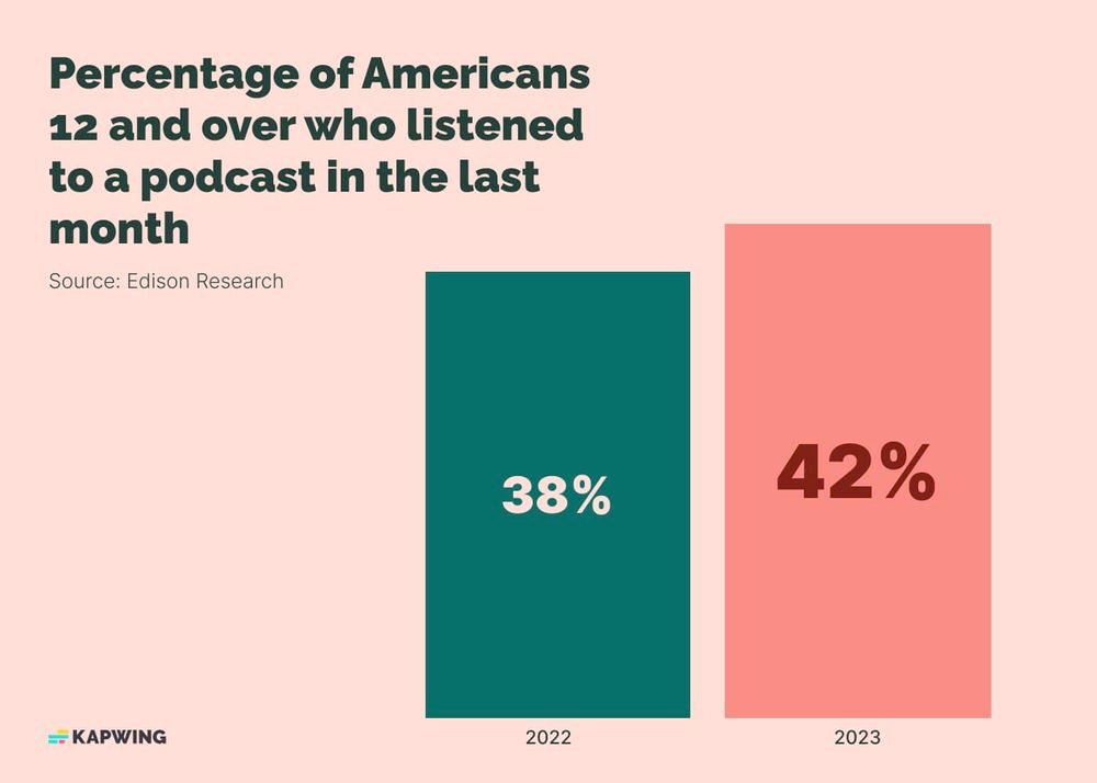 In 2023, 42% of Americans between the ages of 12 and 54 listened to at least one podcast in the last month. 39% listen weekly, and on average, those weekly listeners average nine podcast episodes a week.