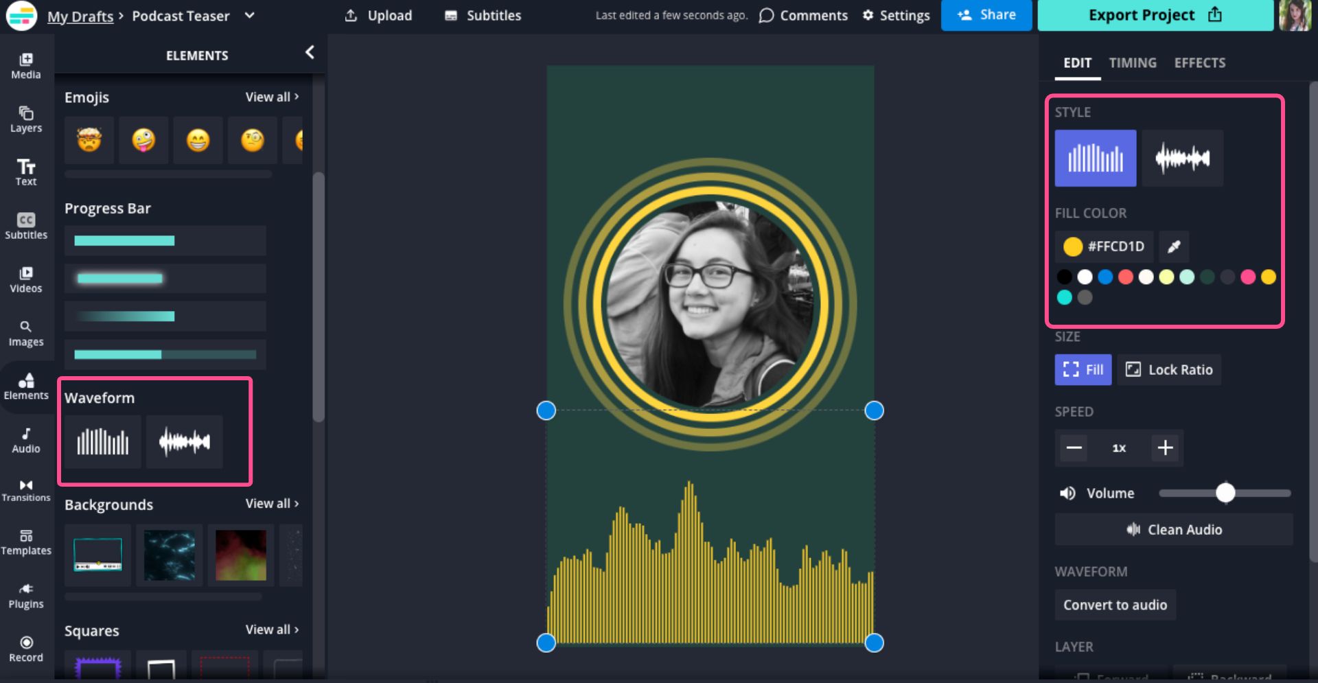 An easy way to turn audio-only content into video content is with a waveform animation. You can add one by uploading your audio file to Kapwing and choosing a waveform from the Elements tab. Change the color of the waveform to match your branding or the podcast's cover artwork.