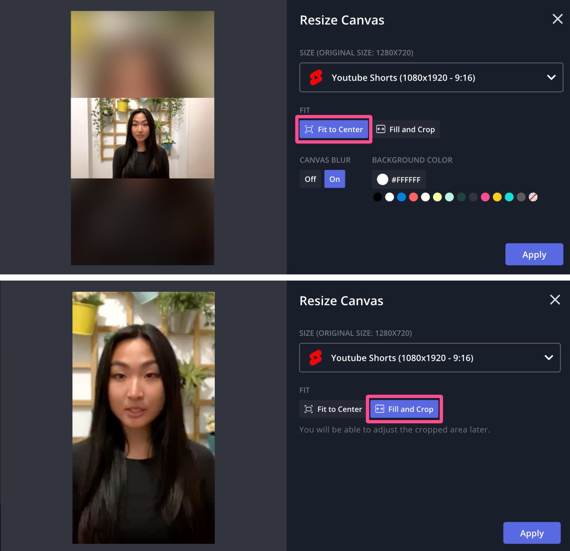 Once you select the new aspect ratio, you'll have the option of "Fit to Center," with or without background blur, or "Fill and Crop." Choose the one that best fits the kind of content you create. For the purposes of this example, I went with the "Fill and Crop" option, so it looks most like videos filmed natively on vertical platforms.