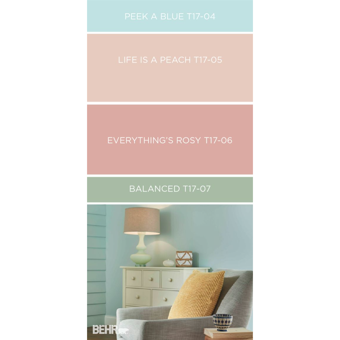 Behr Paint does a great job of showcasing their product by making custom color palettes. This example shows a four color palette (with the names and numbers of the specific paints) next to a room that was painted with those shades.