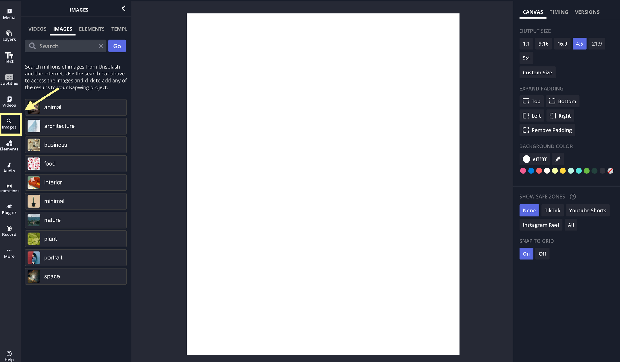 Open up the Kapwing image editor and click "Start with a Blank Canvas." From the main studio window, you'll see the "Images" tab on the left side menu.