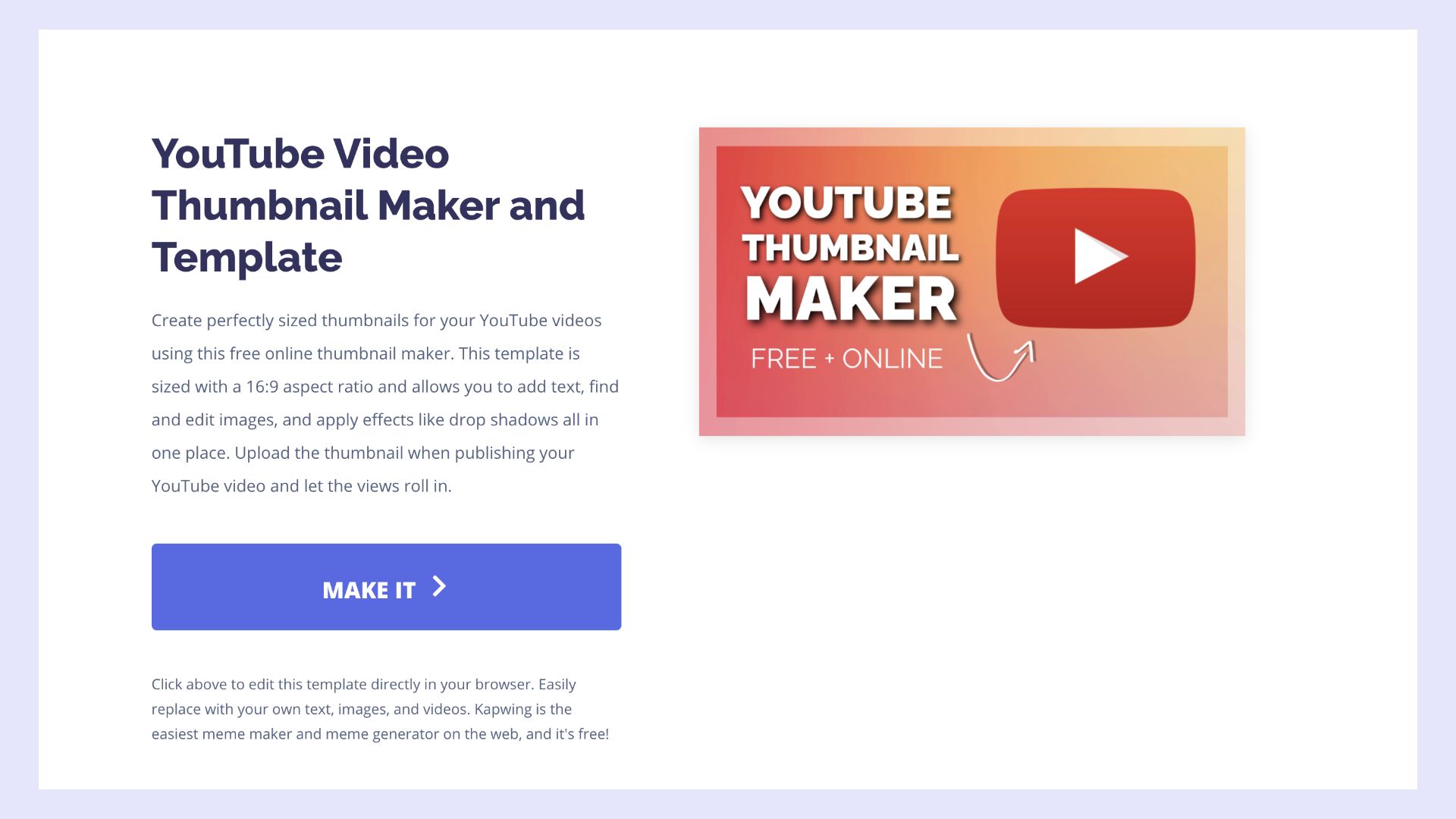 Kapwing's thumbnail maker is fast, easy, and free! Use it to add a thumbnail to any video with ease. Our mission is to provide fast, accessible tools to empower creators and their stories. We believe everyone is a creator, so this tool was made for everyone.