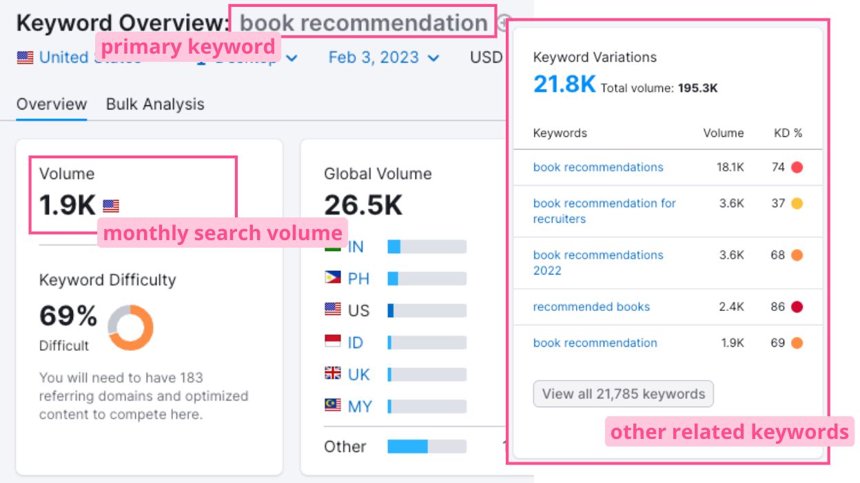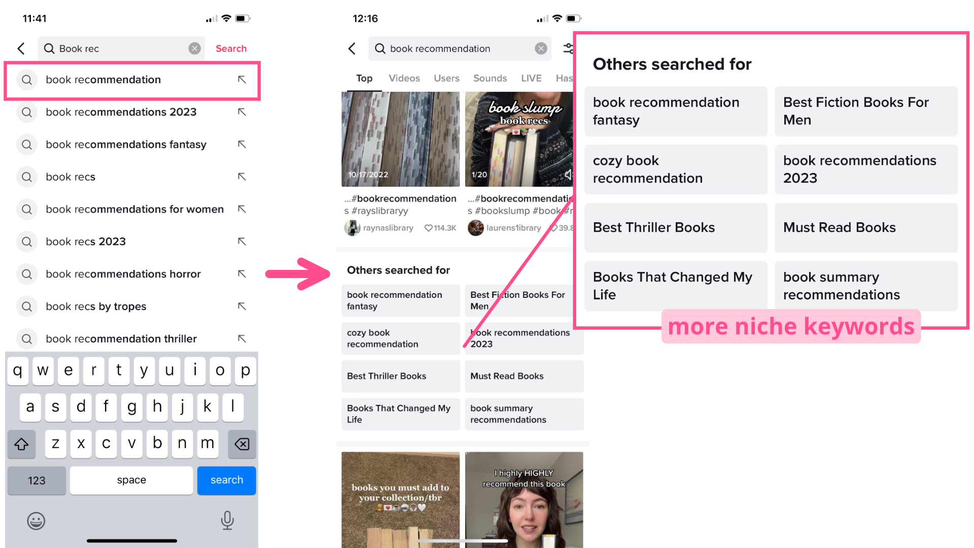 In this example you can see that the primary keyword of "book recommendation" can get you to the more niche keywords of "book recommendation fantasy," "Best Fiction Books for Men,""cozy book recommendations," etc.